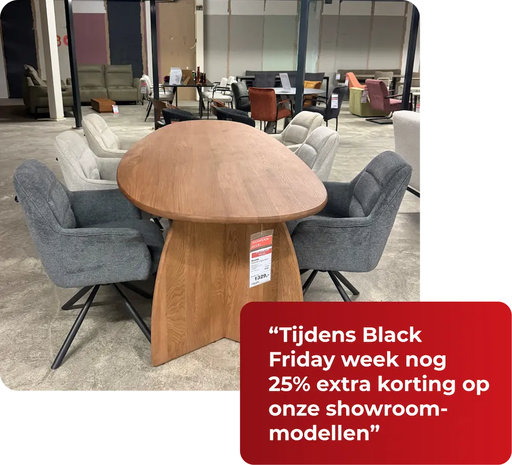 Tijdens Black Friday Week pakken we extra groots uit bij Ruijtermeubel. Op al onze geselecteerde showroommodellen ontvang je nu 25% extra korting bovenop de al scherpe prijzen. Dit is jouw moment om dat ene model waar je al een tijd naar kijkt, direct mee naar huis te nemen tegen een ongekend lage prijs.