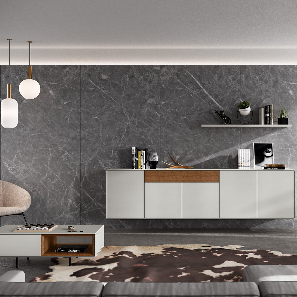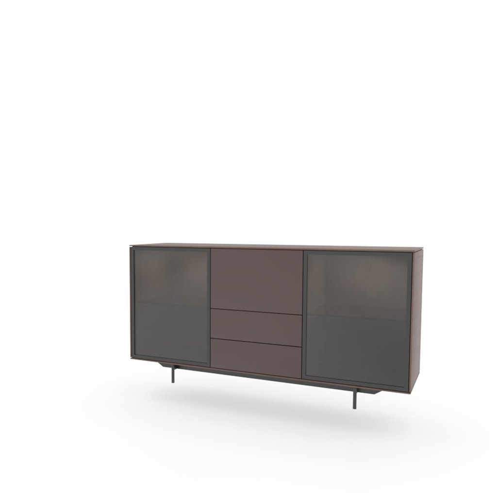 Achter de schuifdeuren van glas bevinden zich verstelbare legplanken: perfect voor servies, decoratie of boeken. De drie centrale laden zijn greeploos en voorzien van push-to-open techniek, wat het minimalistische karakter versterkt. Het geheel straalt rust en verfijning uit – een echte aanwinst voor woon-, eet- of werkkamer.