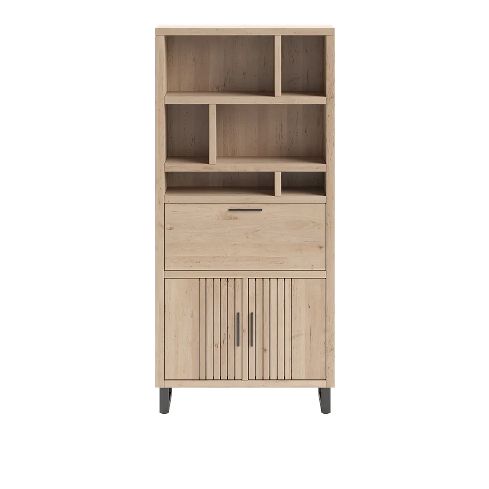 Bergkast Pavi 100cm komt uit de collectie Pavie van Henders & Hazel. Hier vind je 3 verschillende bergkasten met elk hun eigen karakteristieken. Dit is de middelgrote versie van 100cm breed die bestaat uit 2 ruime kastdeuren onderaan, een deur met klep die horizontaal opent in het midden en een bovenste gedeelte met wel 6 open vakken voor je decoratie. Deze kasten zijn zowel met als zonder zwart metalen poten verkrijgbaar. De kasten kunnen ook rechtstreeks op de plinten geplaatst worden voor een stoere, robuuste look. Ook zijn de kasten verkrijgbaar in 2 versies – Castle Black en in een natuurlijke houtkleur Natural. Deze versie is uitgevoerd in Natural.