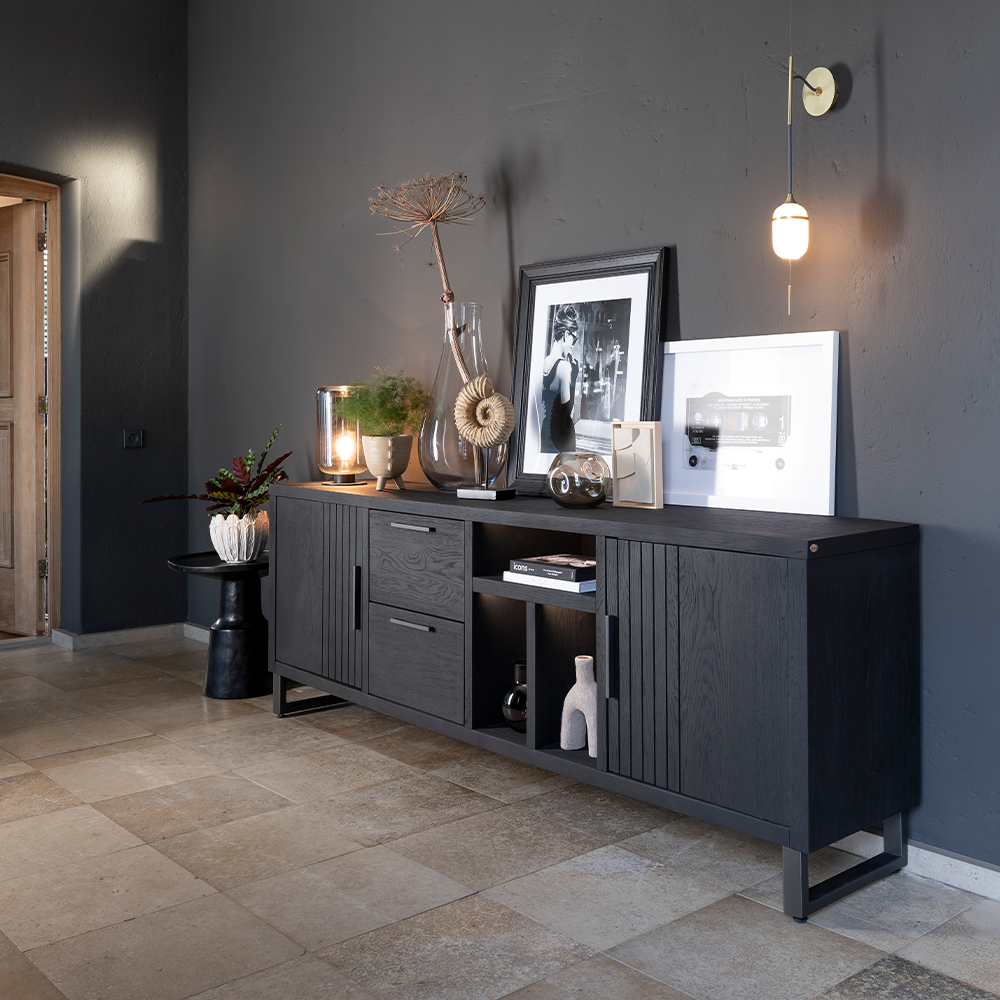Bergkast Pavi 125cm komt uit de collectie Pavi van Henders & Hazel. Hier vind je 3 verschillende bergkasten met elk hun eigen karakteristieken. Dit is de grootste versie van 125cm breed die bestaat uit 2 ruime kastdeuren onderaan, een deur met klep die horizontaal opent in het midden en een bovenste gedeelte met wel 6 grote open vakken voor je decoratie. Deze kasten zijn zowel met als zonder zwart metalen poten verkrijgbaar. De kasten kunnen ook rechtstreeks op de plinten geplaatst worden voor een stoere, robuuste look. Ook zijn de kasten verkrijgbaar in 2 versies – Castle Black en in een natuurlijke houtkleur Natural. Deze versie is uitgevoerd in Castle Black.