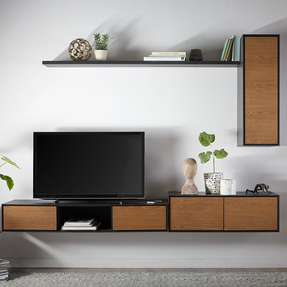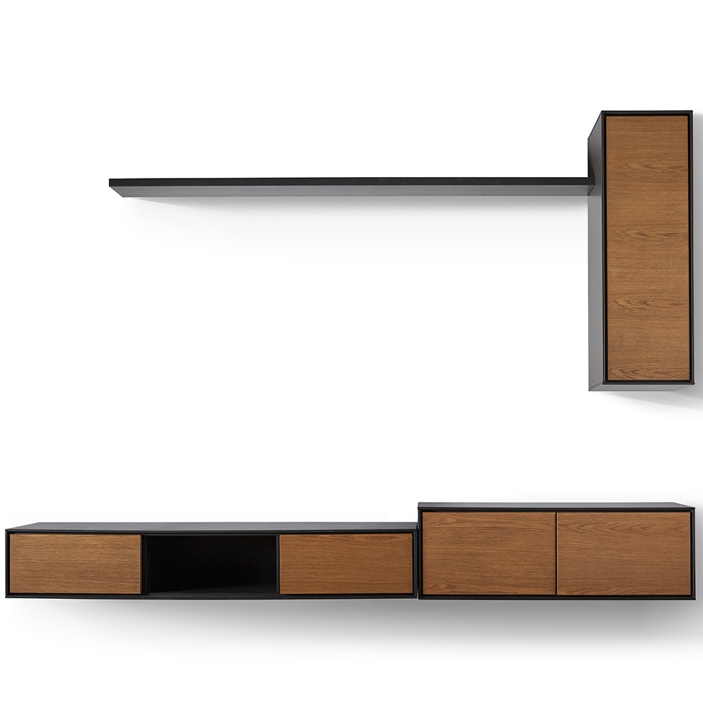 | Uitvoering | TV 2 deuren + 1 open vak + hangkast 1 deur (rechtsdraaiend) + hangkast 1 deur (rechtsdraaiend) + 1 lade + wandplank |