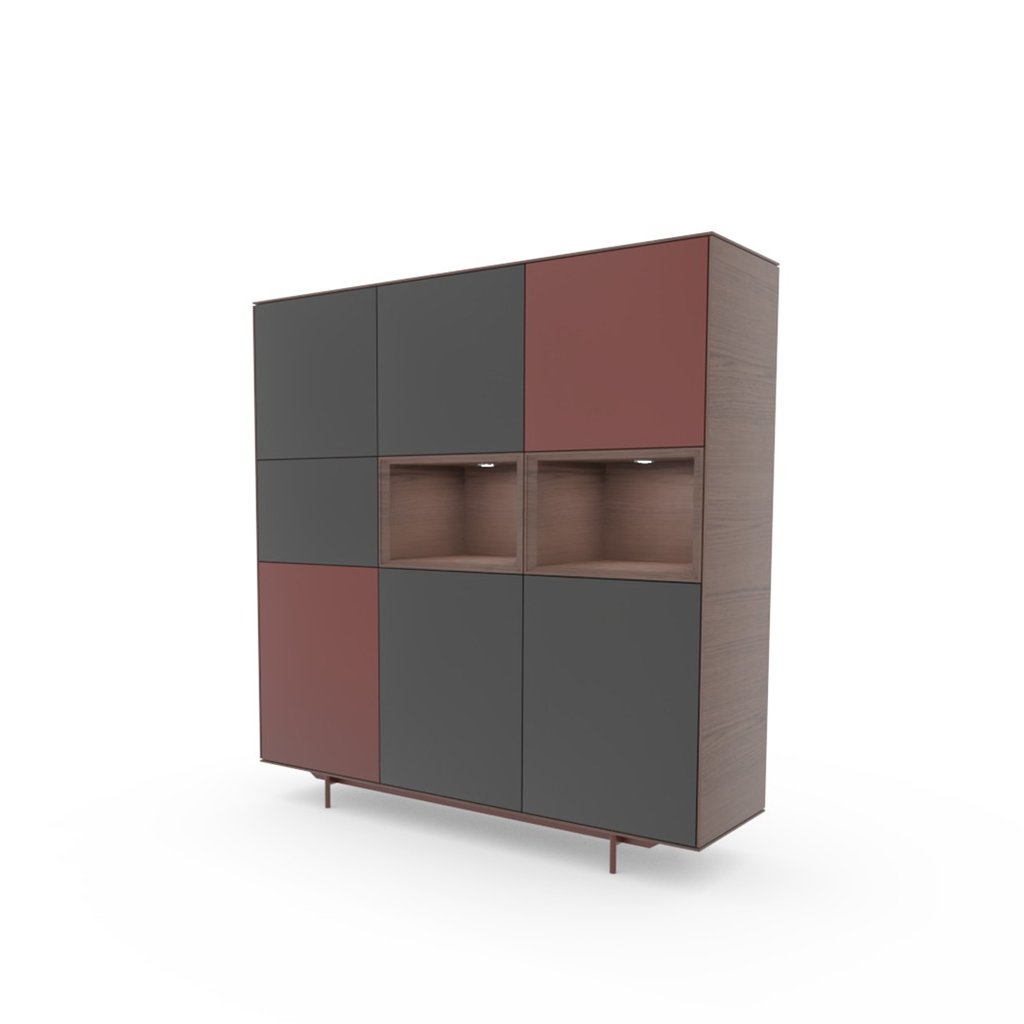 De Wandkast Nyro van Saunaco is een krachtig meubelstatement dat speelt met kleurvlakken, symmetrie en warme houtaccenten. Deze brede, moderne wandkast van 174,3 x 168,8 x 47,5 cm combineert gekleurd matlak met houtfineer in een strak rasterontwerp. De afwisseling tussen gesloten fronten en twee open nissen met geïntegreerde ledverlichting maakt dit meubel functioneel én visueel interessant.