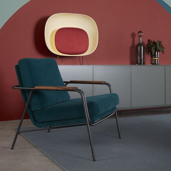 Rechts een moderne maar industriële fauteuil gecombineerd met een design dressoir, contrasterende kleuren die het echte retrogevoel geven.
