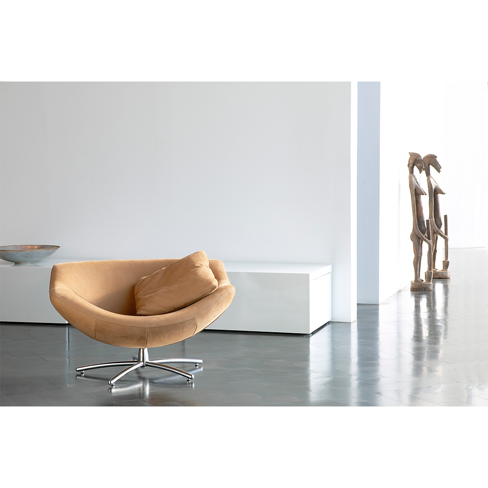 De Gigi is volledig personaliseerbaar en verkrijgbaar in alle stof- en leersoorten uit de Label-collectie. Het standaard draaivoet onderstel is uitgevoerd in black grey, maar voor een luxere uitstraling kun je kiezen voor geborsteld chroom, nickel metallic of een poedercoating (tegen meerprijs). Voor nog meer comfort zijn er een bijpassende poef en een heerlijk zacht donzen kussen beschikbaar.
