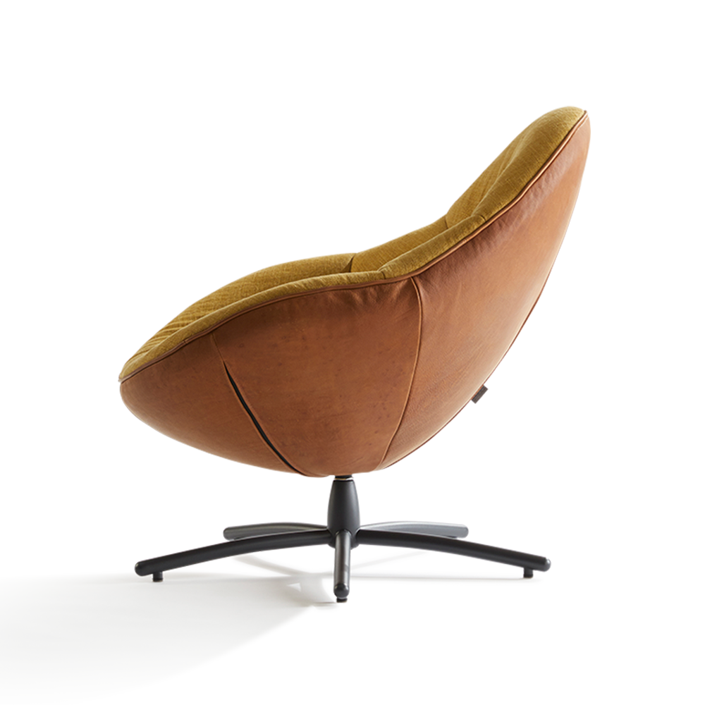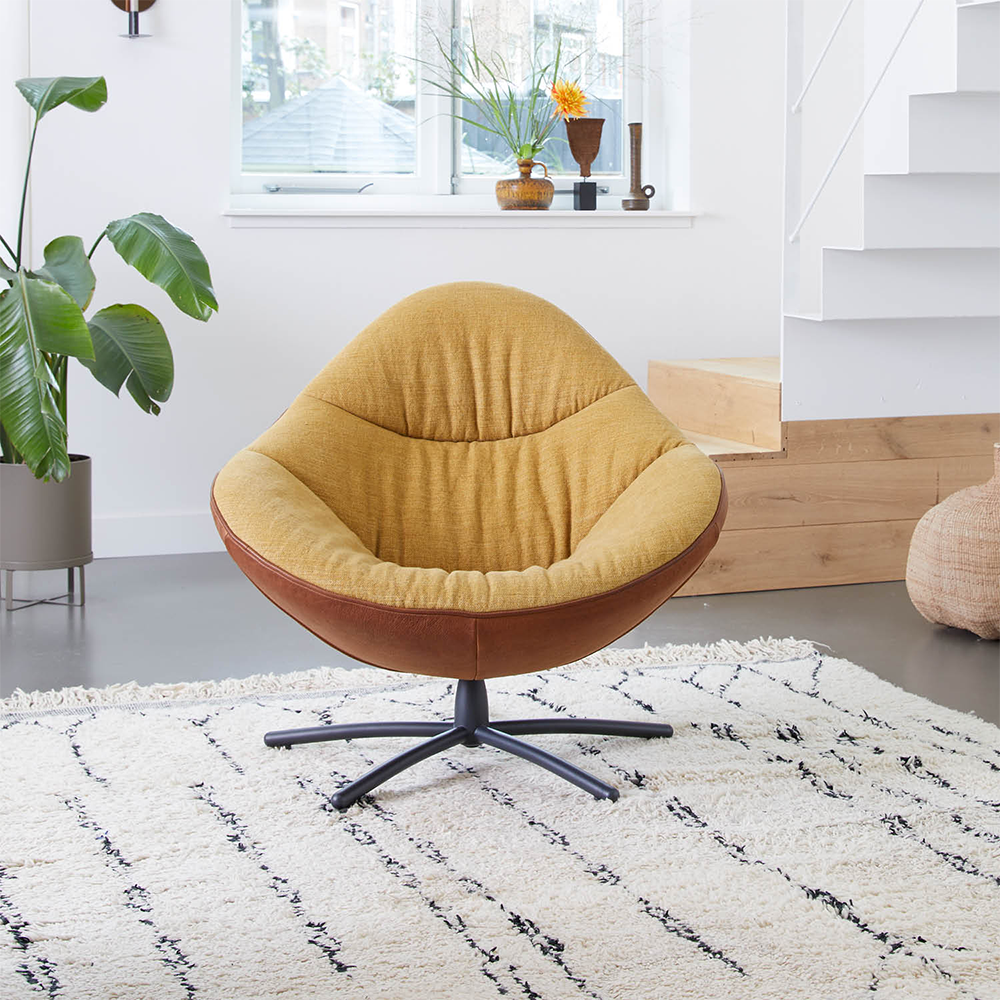 Hidde kan geleverd worden in diverse stof- en ledersoorten. De draaivoet kan ik chroom of black grey poedercoat. Hierdoor kan je de fauteuil helemaal aanpassen aan jouw wensen en behoeften.