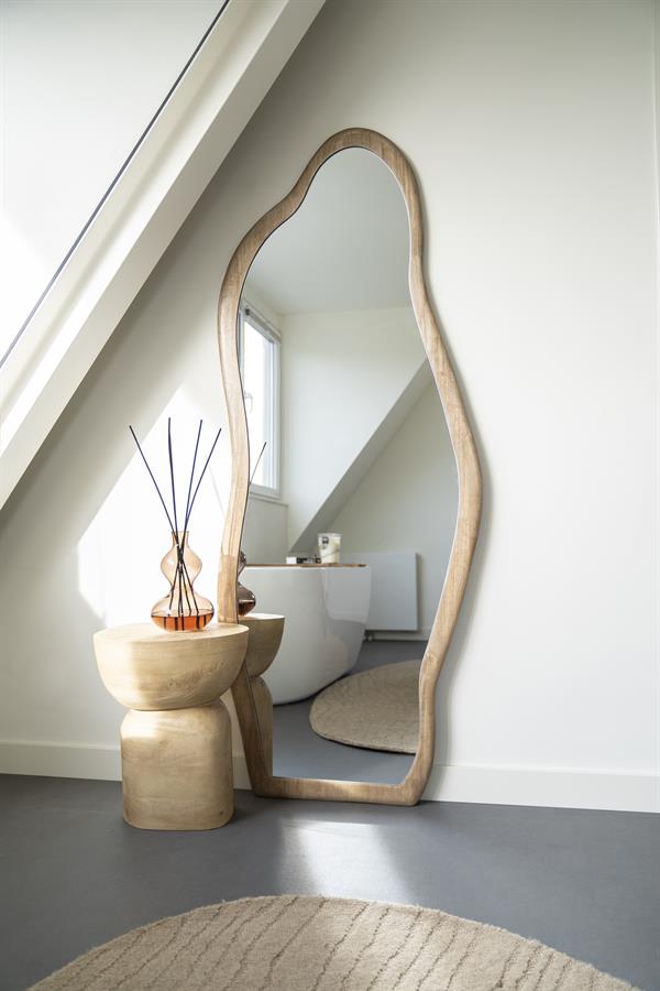 Een klassieke, maar nog altijd effectieve manier om je woonkamer groter te laten lijken: spiegels! Door een grote spiegel tegenover een raam te hangen, weerkaats je het daglicht en lijkt de kamer letterlijk te verdubbelen. Daarnaast helpen meubels met veel glas of open structuren. Denk aan een tv-module of wandmeubel met open vakken of glazen deuren, zodat je niet een massief blok hebt dat de ruimte visueel afsnijdt. Bij De Ruijtermeubel kun je bijvoorbeeld kijken naar de dressoir Livada 210 – Naturel (Henders & Hazel) met een lichte houtlook en metalen accenten.