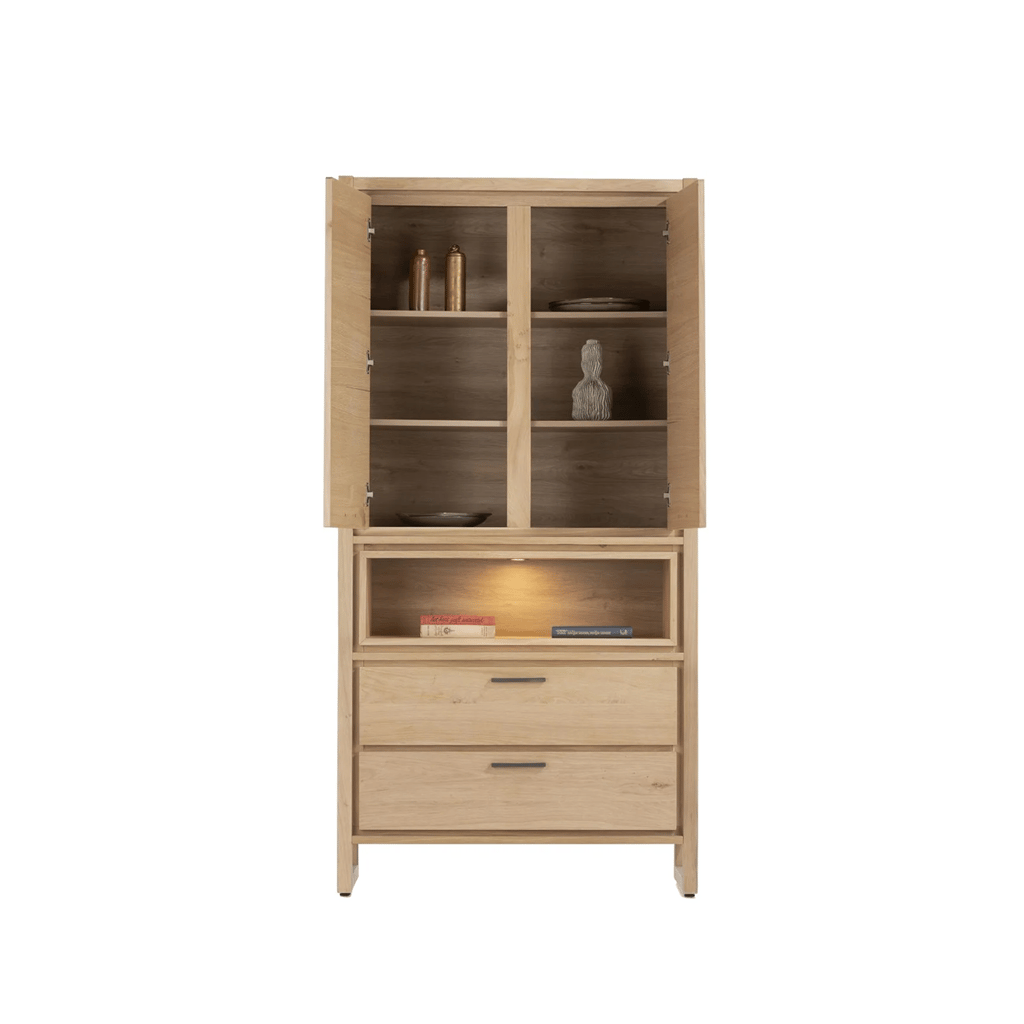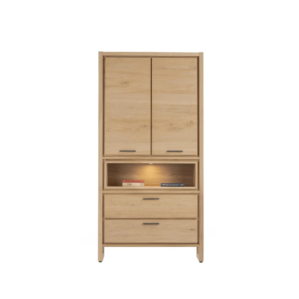 De kast is uitgevoerd in eikenfineer in de kleur Dune Natural, een tint die warmte en gezelligheid uitstraalt. De afwerking met platinumlak zorgt niet alleen voor een stijlvolle, matte uitstraling, maar maakt de kast ook extra duurzaam. Hierdoor blijft de Nystead jarenlang een blikvanger in je interieur.