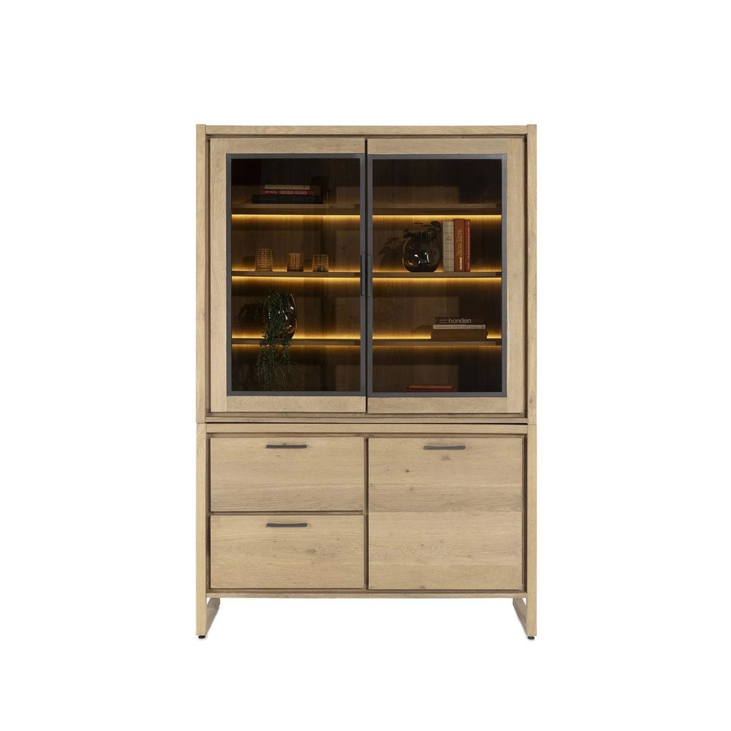 De Buffetkast Nystead biedt volop opbergruimte dankzij de slimme indeling met 2 lades, 1 dichte deur, en 2 glasdeuren. In de glazen vitrinedelen kun je jouw mooiste accessoires, servies of decoratieve items stijlvol presenteren. Dankzij de ingebouwde ledverlichting worden deze items subtiel in de spotlight gezet, waardoor je interieur extra sfeer krijgt.