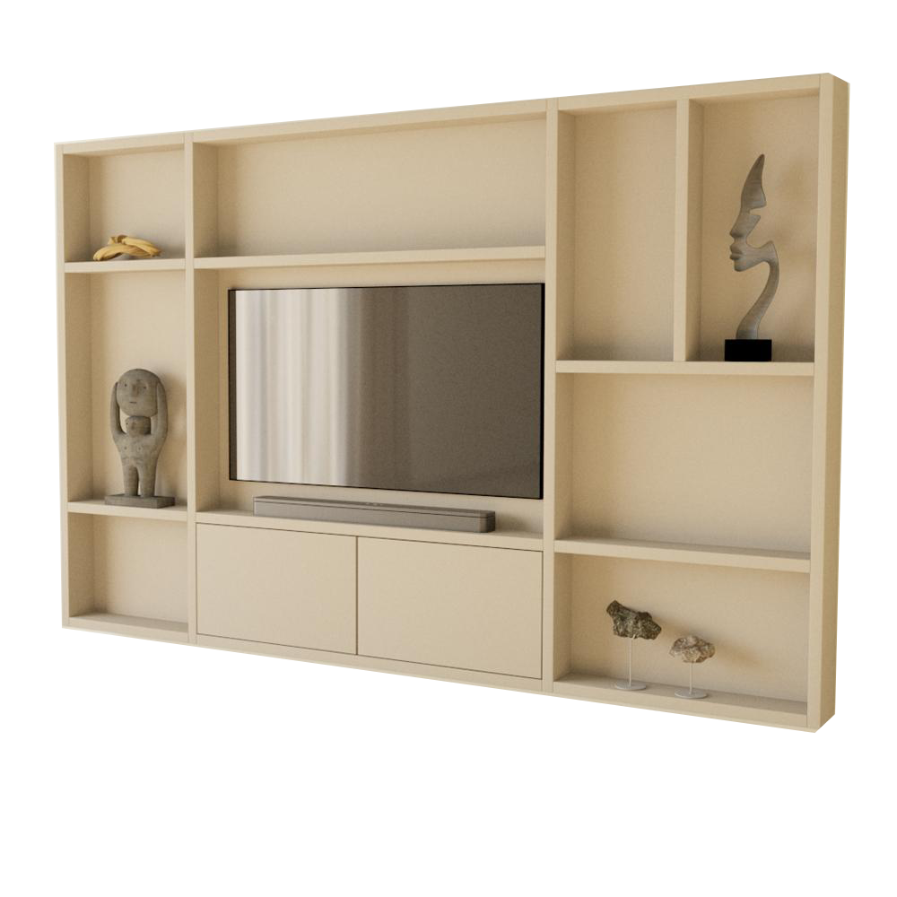 Wij begrijpen dat elke televisie uniek is, en daarom biedt de Tripoli cinewall de flexibiliteit om de nismaat van de tv aan te passen aan jouw specifieke wensen en de afmetingen van je tv en accessoires. Zo kan je kiezen tussen de diepte 18 en 25 cm. Onder de tv bevinden zich twee handige kleppen, perfect voor het opbergen van kleine benodigdheden. De overgebleven ruimte in de kast kun je naar eigen inzicht inrichten met kunstwerken, pockets of decoratieve items.