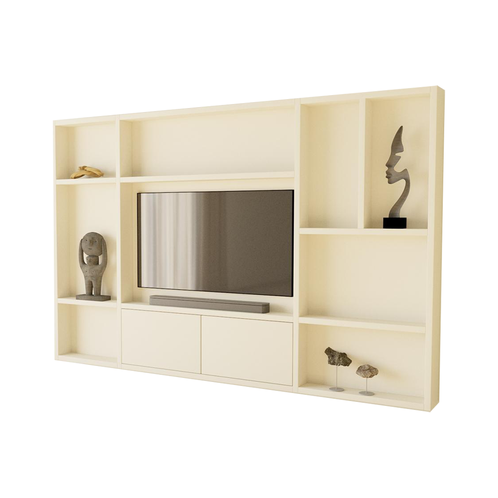 Wij begrijpen dat elke televisie uniek is, en daarom biedt de Tripoli cinewall Oyster Beige de flexibiliteit om de nismaat van de tv aan te passen aan jouw specifieke wensen en de afmetingen van je tv. Zo kan je kiezen tussen een diepte van 18 cm of van 25 cm. Onder de tv bevinden zich twee handige kleppen, perfect voor het opbergen van kleine benodigdheden. De overgebleven ruimte in de kast kun je naar eigen inzicht inrichten met kunstwerken, pockets of decoratieve items.