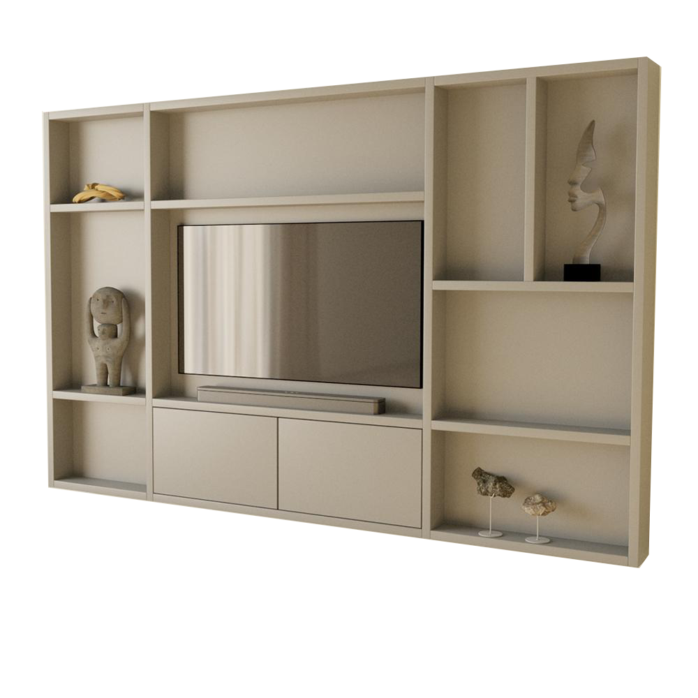 Wij begrijpen dat elke televisie uniek is, en daarom biedt de Tripoli Cinewall de flexibiliteit om de nismaat van de tv aan te passen aan jouw specifieke wensen en de afmetingen van je tv en accessoires. Zo kan je kiezen tussen de diepte 18 en 25 cm. Onder de tv bevinden zich twee handige kleppen, perfect voor het opbergen van kleine benodigdheden. De overgebleven ruimte in de kast kun je naar eigen inzicht inrichten met kunstwerken, pockets of decoratieve items.
