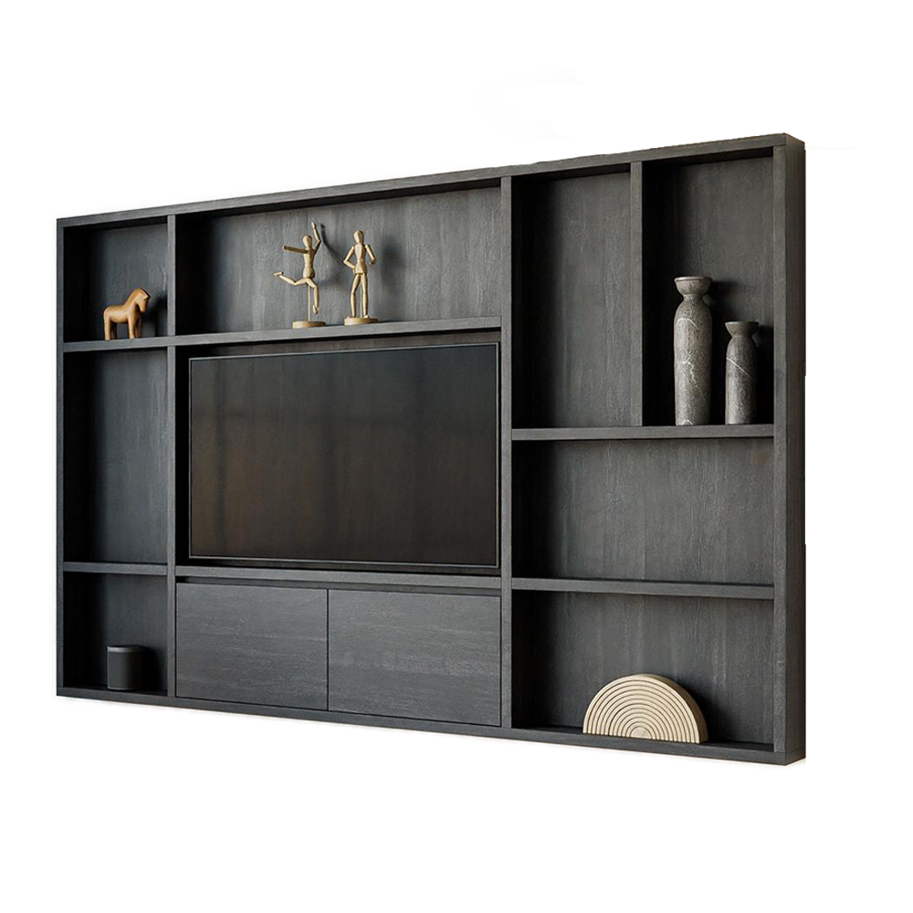 Wij begrijpen dat elke televisie uniek is, en daarom biedt de Tripoli cinewall de flexibiliteit om de nismaat van de tv aan te passen aan jouw specifieke wensen en de afmetingen van je tv. Zo kan je kiezen tussen een diepte van 18 cm of van 25 cm. Onder de tv bevinden zich twee handige kleppen, perfect voor het opbergen van kleine benodigdheden. De overgebleven ruimte in de kast kun je naar eigen inzicht inrichten met kunstwerken, pockets of decoratieve items.
