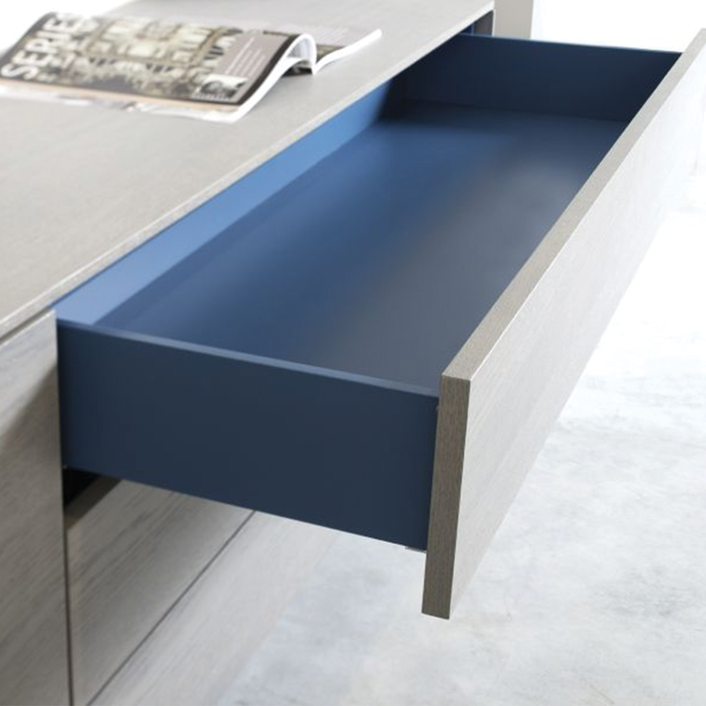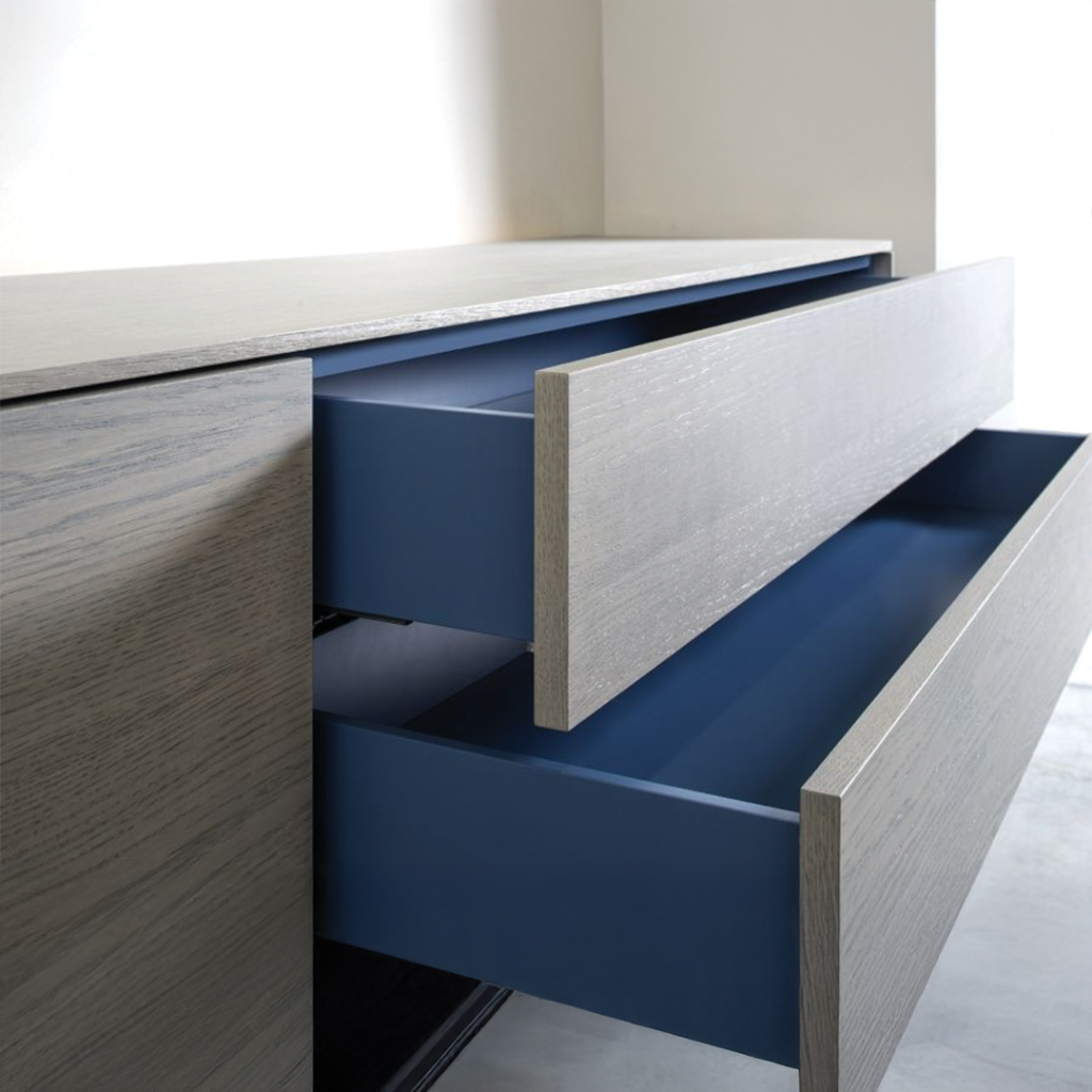 Wat het GOYA 26 dressoir zo bijzonder maakt, is het speelse contrast tussen binnen en buiten. Aan de buitenkant presenteert het meubel zich rustig en elegant in een warme grijze houtfinish, maar zodra je een deur opent of een lade uittrekt, word je verrast door het diepe marineblauw van het interieur. Dit onverwachte kleuraccent geeft het dressoir karakter en persoonlijkheid, zonder dat het visueel te druk wordt.