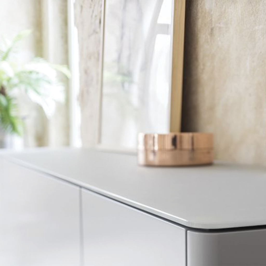Wat het GOYA 9 dressoir zo tijdloos maakt, is de minimalistische vormgeving. De strakke horizontale lijnen van de laden worden gebalanceerd door verticale kastdeuren, wat zorgt voor een harmonieus en evenwichtig geheel. De push-to-open deuren en laden hebben geen zichtbare grepen, waardoor het front volledig clean blijft. Dit versterkt de serene uitstraling en zorgt ervoor dat het meubel nooit visueel opdringerig wordt.