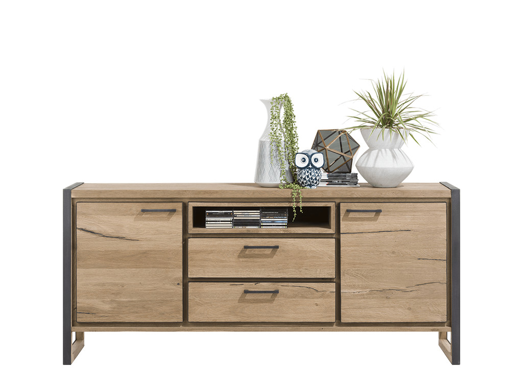Dressoir Metalo komt uit de stoere wooncollectie van Henders en Hazel. In deze serie zijn er naast diverse dressoirs ook tafels en kasten te vinden. Deze uitvoering heeft 2 deuren, 2 laden en 1 niche, hierdoor is opruimen een eitje. Verder zijn de metalen accenten opvallend aan deze kast, zowel in de poten die doorlopen als de frames rondom de deuren, laden en niche. Daarnaast is deze kast gemaakt van eikenhoutfineer waardoor het een mooie natuurlijke tekening heeft.