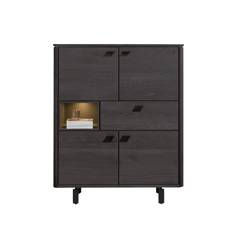 Het highboard heeft 4 deuren, 1 lade en 1 niche. Een sfeervol detail is de geïntegreerde ledverlichting in de niche.
