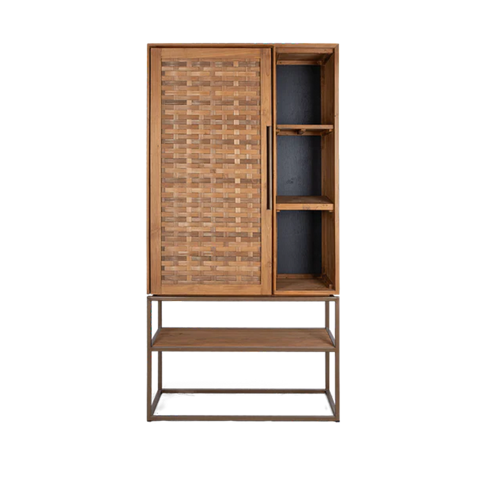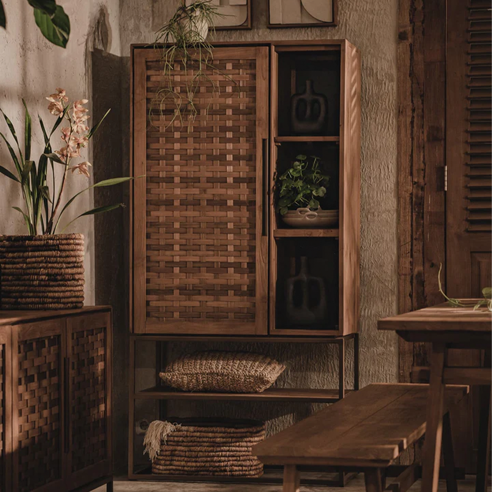 Kabinet Karma is een meubelstuk dat niet alleen functioneel is, maar ook een statement maakt in je interieur. Maak kennis met de stijlvolle en veelzijdige Karma Pure Cabinet, met de hand vervaardigd van gerecycled teakhout en voorzien van unieke details die je hart sneller laten kloppen. Dit bijzondere kabinet heeft een open rek en drie open planken, waardoor je jouw favoriete voorwerpen kunt tentoonstellen en gemakkelijk kunt bereiken. Maar dat is niet alles! De prachtige deur, met zijn structuur van handgeweven bamboe, voegt een vleugje elegantie toe aan het geheel. Het contrast tussen het natuurlijke hout en bamboe, gecombineerd met het matte messing frame, creëert een verfijnde vintage industriële uitstraling die direct de aandacht trekt.
