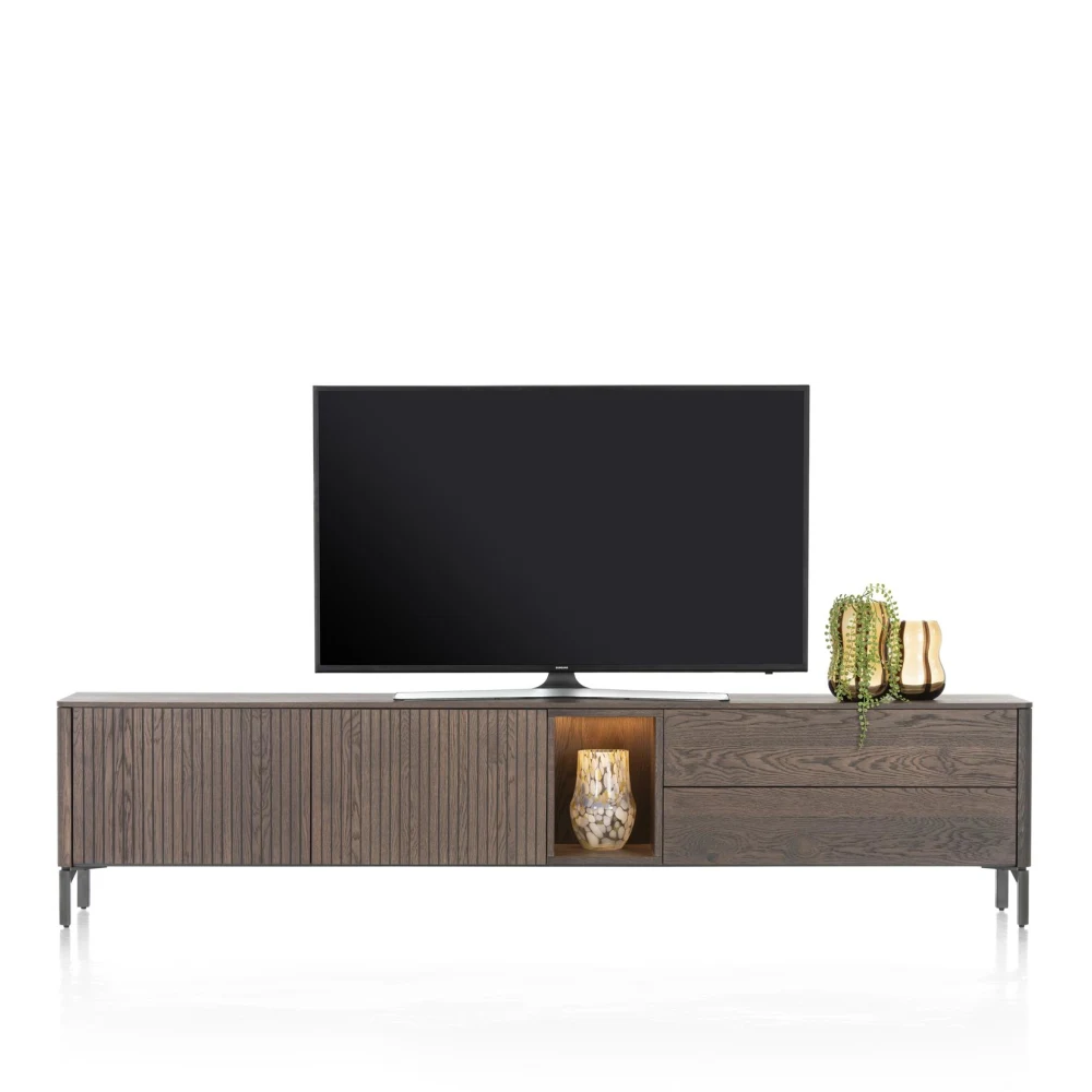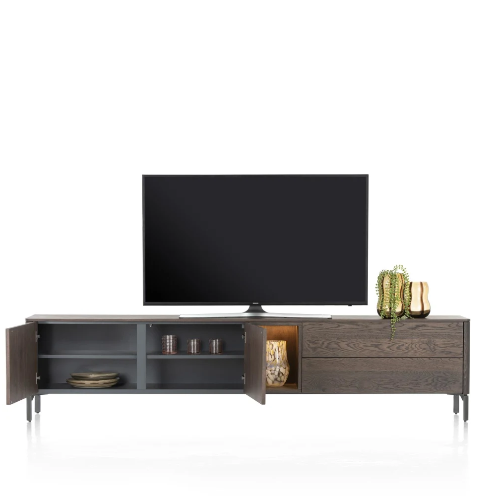 Achter de twee deuren en in de twee ruime laden is voldoende plek voor elektronica, boeken en andere woonaccessoires. Alles is netjes opgeborgen, maar toch gemakkelijk toegankelijk dankzij het push to open systeem. Het open nichevak met geïntegreerde ledverlichting is perfect om een persoonlijk accent aan je interieur te geven, bijvoorbeeld met een kunstobject, plant of fotolijstje.