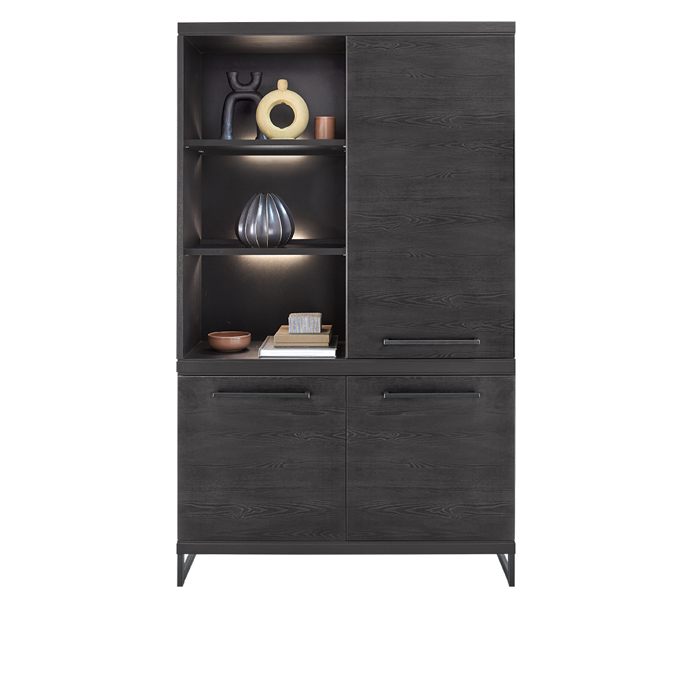Opbergkast Formia is onderdeel van een volledig woonprogramma in de donkere kleur noir. In combinatie met het zwarte metalen frame geeft dit de artikelen een trendy uitstraling en past hierdoor in vele woonkamers. Dankzij de hoogwaardige Lamulux afwerking hebben de meubelen de uitstraling en het gevoel van echt hout, maar zijn ze zeer kras-, slijt- en stootvast en makkelijk in onderhoud.