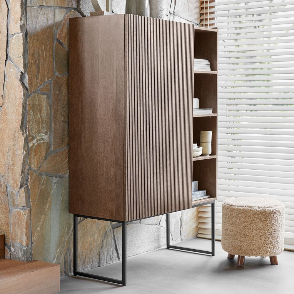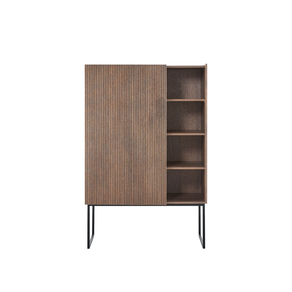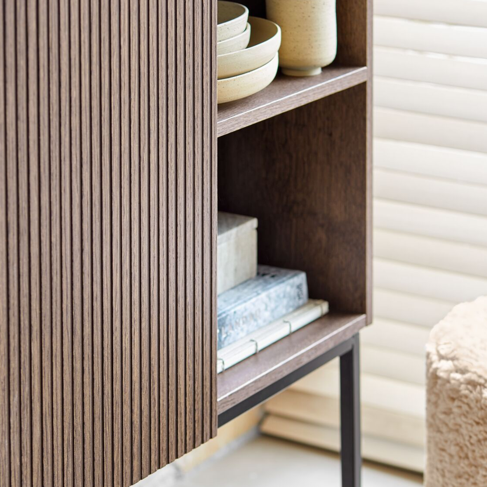 Opbergkast Marandi is dé perfecte oplossing als je op zoek bent naar een stijlvol meubel met zowel gesloten als open opbergruimte. De combinatie van bruin eikenfineer, een geribbelde frontstructuur en zwarte metalen poten geeft deze kast een stoere, moderne uitstraling. Een functioneel ontwerp dat niet alleen opvalt door zijn looks, maar ook door zijn praktische indeling. Ideaal voor wie houdt van opgeruimd én sfeervol wonen.