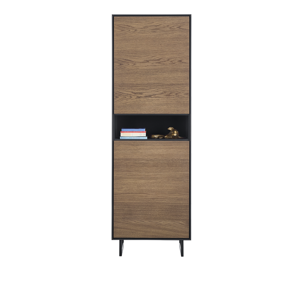Opbergkast Verdo springt meteen in het oog door zijn prachtige vormgeving. De combinatie van de zwarte structuurlak en het eiken fineer in kasteelbruin hebben een frisse en eigentijdse look. Daarnaast zijn de uitvoeringen zoals getoond ook nog eens snel leverbaar, waardoor je snel kunt genieten van je nieuwe aankoop!
