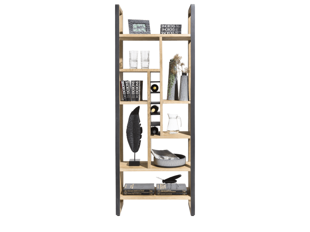 De roomdivider is gemaakt van eikenfineer in combinatie met metaal. Bijzonder aan Metalo is dat de ijzeren poten helemaal doorlopen naar boven. Hierdoor krijgt de kast een eigen twist en is het net wat bijzonderder. Ook heeft de kast 8 niches waarin je boeken, vazen of fotolijstjes in kan showen. Daarnaast heeft de kast 6 vakken waar (wijn)flessen in passen.
