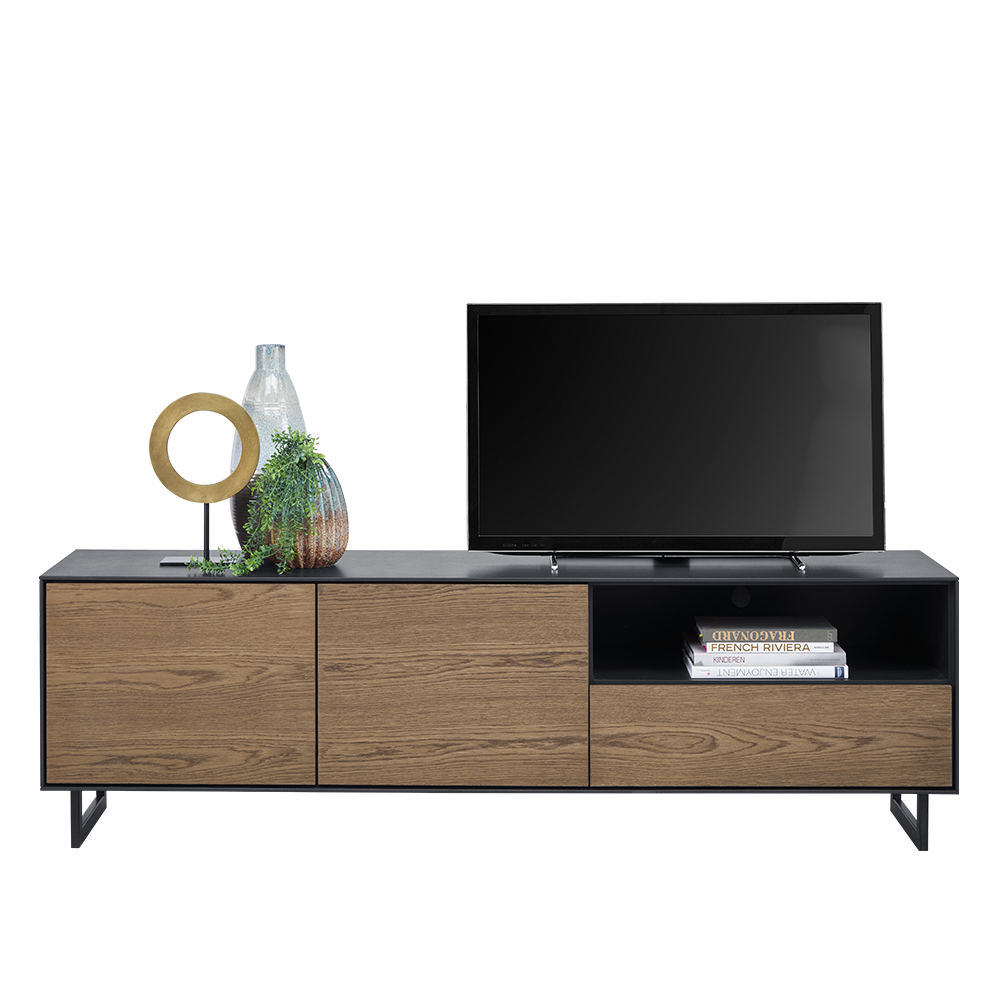 Tv meubel Verdo springt meteen in het oog door zijn prachtige vormgeving. De combinatie van de zwarte structuurlak en het eiken fineer in kasteelbruin hebben een frisse en eigentijdse look. Daarnaast zijn de uitvoeringen zoals getoond ook nog eens snel leverbaar, waardoor je snel kunt genieten van je nieuwe tv dressoir!