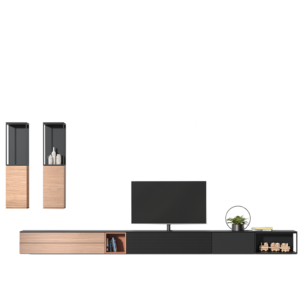 Tv meubel Cas 127 is een ultra-modulair kastensysteem opgebouwd vanuit een strakke geometrie en gebaseerd op een ragfijne afwerking en slimme details. De strakke meubels van tv meubel Cas van Saunaco zijn uniek door hun architecturale uiterlijk en modulaire karakter.