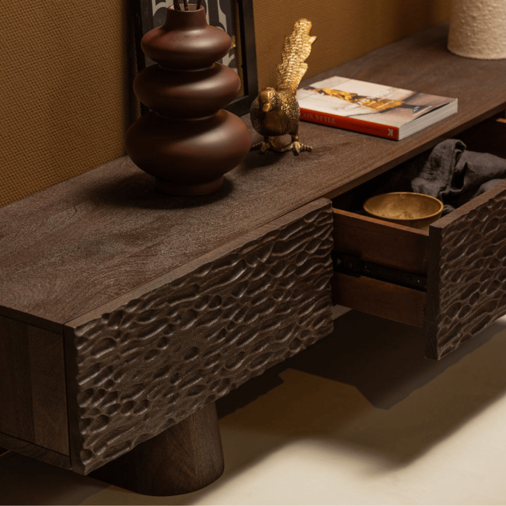 Mangohout staat bekend om zijn duurzame groei en lange houdbaarheid. Daarnaast is het heel makkelijk te onderhouden. Niet alleen is dit tv-meubel duurzaam, maar ook enorm efficiënt. Het biedt enorm veel opbergruimte door de drie praktische lades. Bovenop de kast is er genoeg ruimte om een tv te plaatsen en nog wat leuke accessoires, zoals een opvallende lamp of een plant om de natuurlijke uitstraling nog meer te versterken. Kortom: door de duurzaamheid van het meubel, de praktische opbergruimten en de natuurlijke uitstraling van het meubel, kun je jarenlang van tv-meubel Crumble genieten.