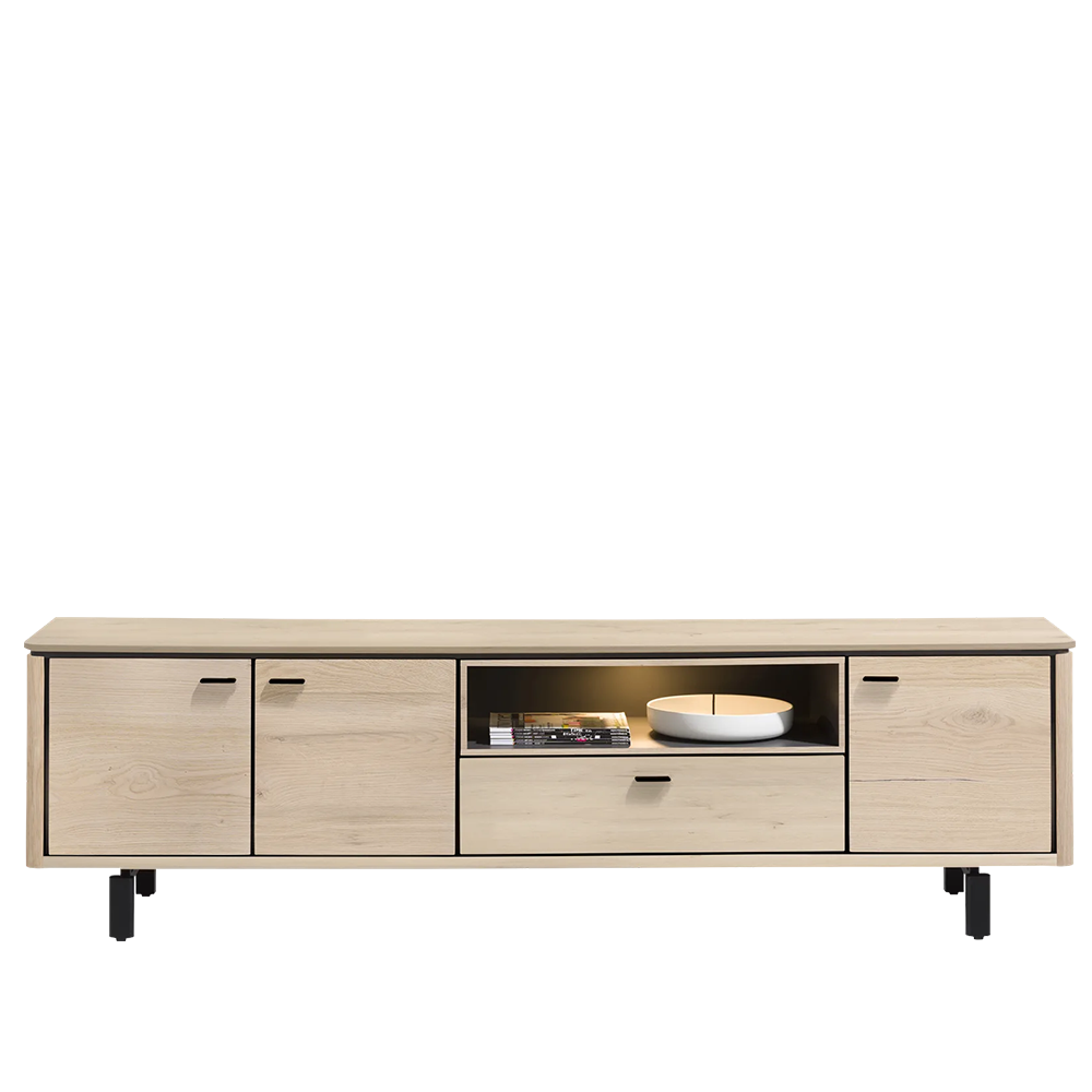 Heb je een mooie eyecatcher dat gezien mag worden? Of heb je een fraaie verzameling woondecoraties om uit te stallen? Dan is dit Tv meubel de oplossing. Deze moderne kast is afkomstig uit de Livada collectie. Dit moderne Tv meubel is afkomstig uit de Livada collectie en is 210 cm breed. Er zijn 3 deuren, 1 klep en 1 niche om spullen in op te bergen. Het tv-meubel is gemaakt van wild eiken fineer en afgewerkt in de kleur Natural. De zwart metalen accenten zorgen voor een stoere finishing touch.