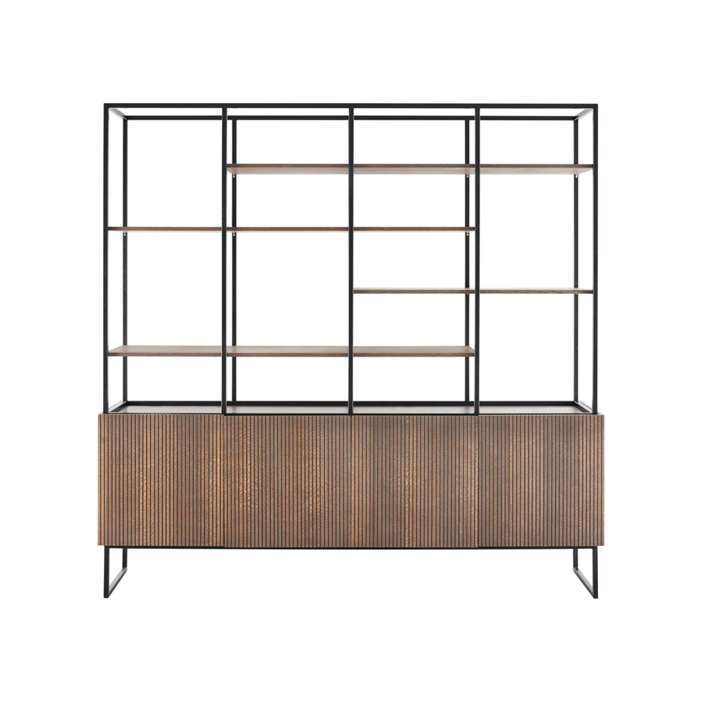 Het onderste deel – het dressoir – beschikt over vier deuren met een push-to-open en soft-close mechanisme. Hierdoor blijft het front strak en greeploos, terwijl je toch profiteert van gebruiksgemak en een hoogwaardige afwerking. Het open opzetrek bovenop is voorzien van vier houten planken, ideaal om te decoreren met boeken, accessoires of planten.