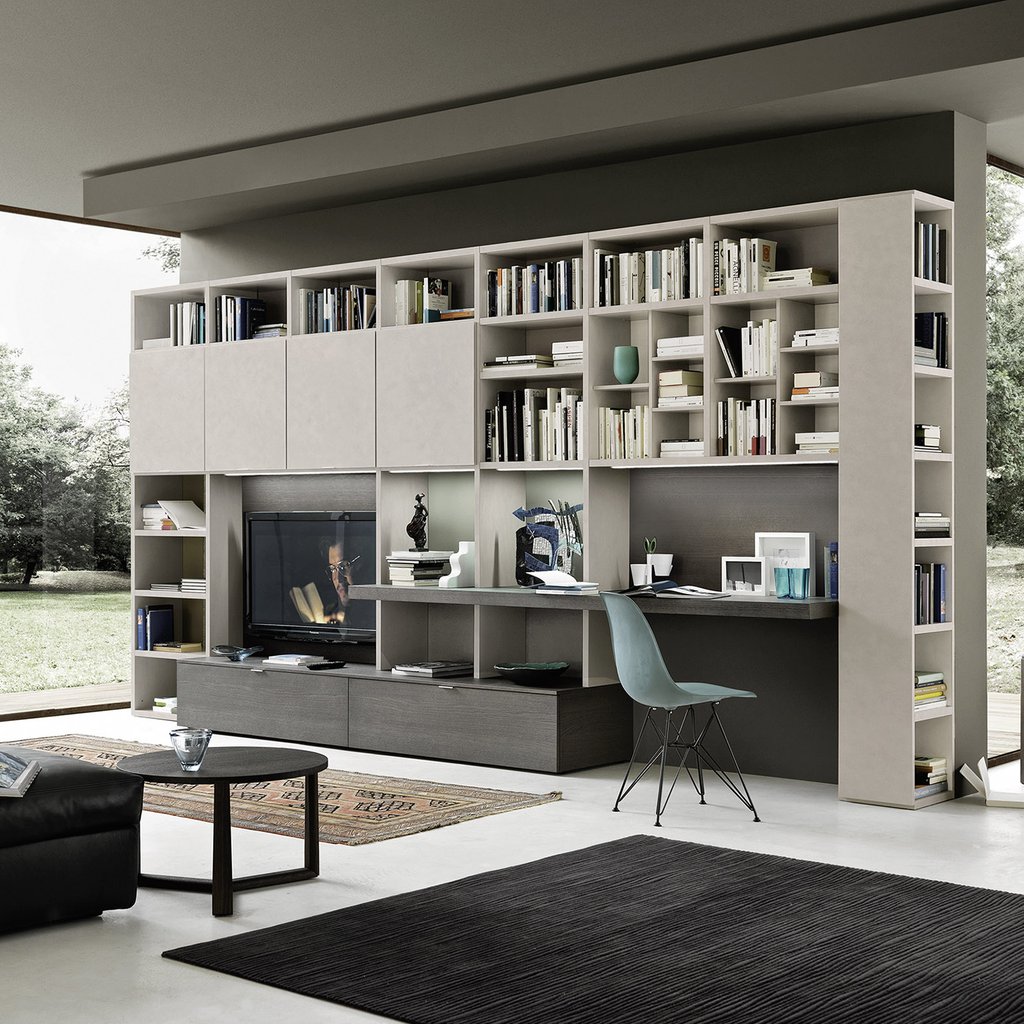 De kast bestaat uit open en gesloten delen, met klepkasten, deuren en lades in de tinten Loto Tortora en Grey Oak. De tv-zone is afgewerkt met een bijpassend achterpaneel in Grey Oak, terwijl het werkgedeelte is opgebouwd met rasterunits, open vakken en een zwevende bench. Dankzij het push-to-open systeem blijft het geheel strak en greeploos. De werkplek is subtiel geïntegreerd en biedt voldoende ruimte voor een laptop, papieren en persoonlijke items.