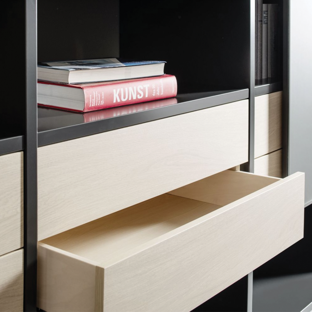 De SINUS 51 wandkast kan worden uitgevoerd met laden, kleppen en schuifpanelen, afhankelijk van jouw wensen. De laden bieden ruimte voor kleinere items zoals documenten, kabels of woonaccessoires, terwijl de grotere vakken ideaal zijn voor boeken en decoratie. Alles is voorzien van hoogwaardige rails en soft-close systemen, wat zorgt voor een comfortabele en stille bediening.