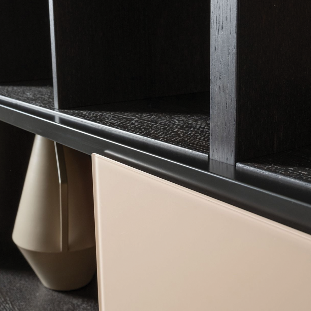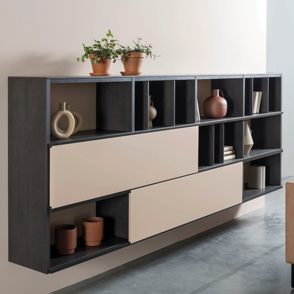 De SINUS 59 wordt aan de wand gemonteerd, waardoor het meubel lijkt te zweven. Dit geeft niet alleen een moderne, luchtige uitstraling, maar maakt het ook eenvoudig om eronder schoon te maken. De combinatie van verschillende materialen – zoals donker eikenhout met lichte gelakte fronten – zorgt voor visuele diepte en karakter. De subtiele aluminium lijsten tussen de vakken geven structuur en benadrukken het modulaire karakter.