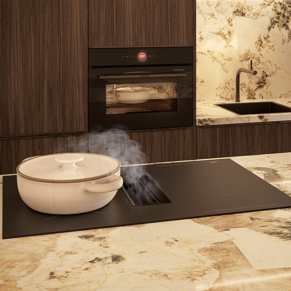 - Matte en krasbestendige inductiekookplaat met geïntegreerde afzuiging