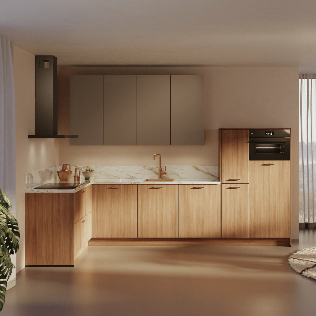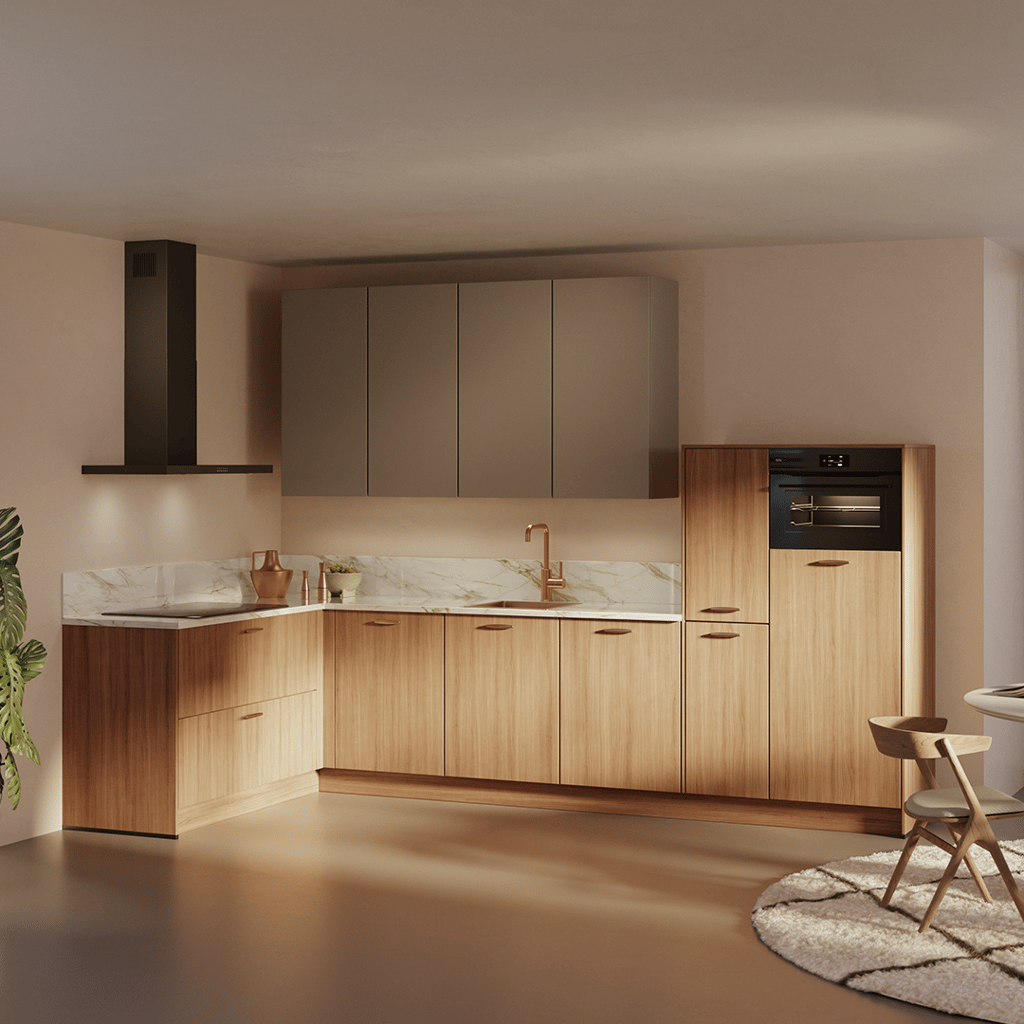 Keuken Ensor Karamel combineert een warme, natuurlijke uitstraling met een strak en modern design. De diepe karameltinten geven deze keuken een luxe en uitnodigende sfeer, terwijl de strakke lijnen en hoogwaardige afwerking zorgen voor een eigentijdse uitstraling. Met deze keuken creëer je een stijlvolle leefruimte waarin koken en samenkomen centraal staan.