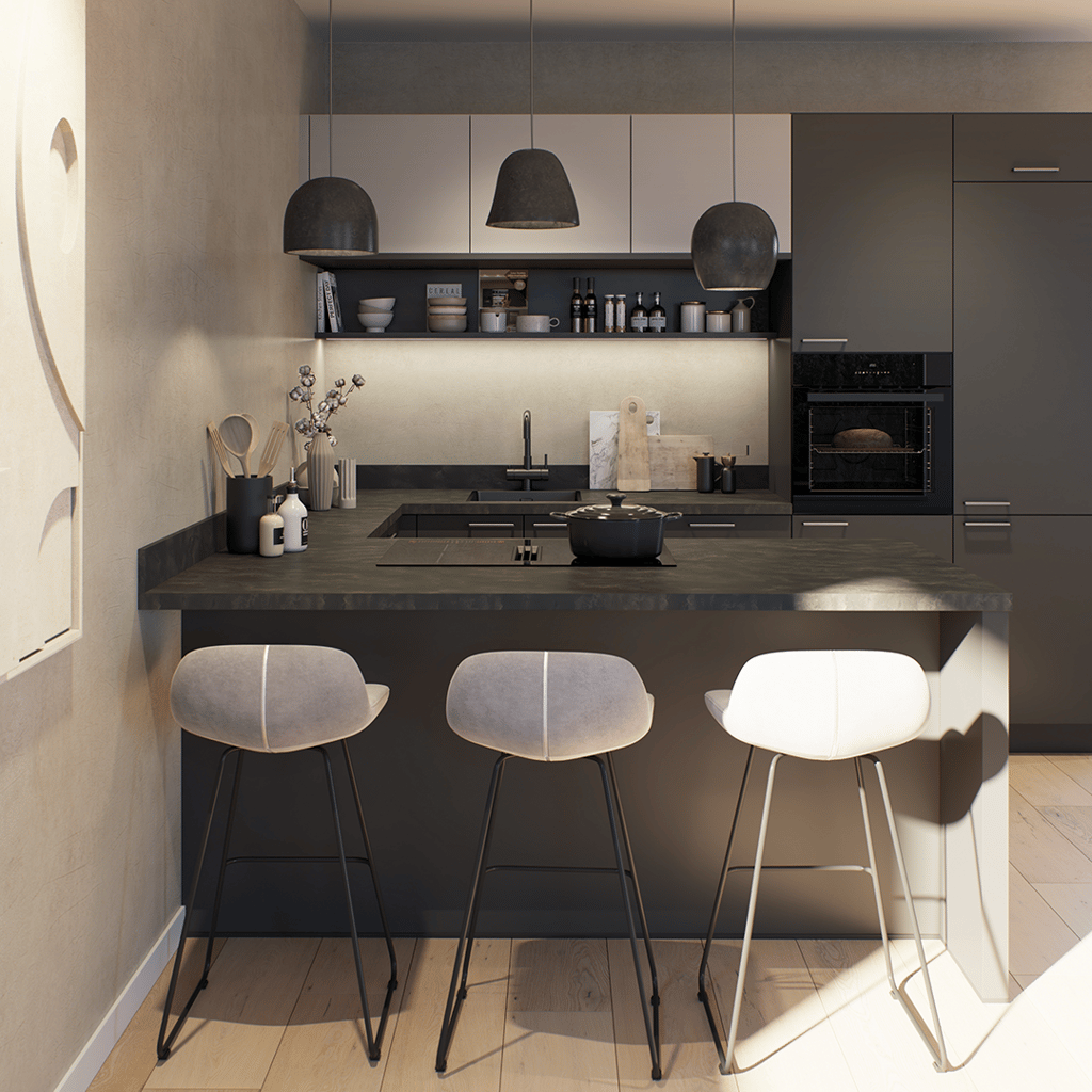 Met zijn strakke lijnen en donkere afwerking straalt Keuken Franchetti Lavazwart een minimalistische en luxe sfeer uit. Het krasbestendige en onderhoudsvriendelijke werkblad biedt een robuuste basis voor dagelijks gebruik, terwijl slimme opbergoplossingen en ergonomische indelingen zorgen voor optimaal gebruiksgemak. De subtiele textuur van de lavazwarte fronten geeft de keuken extra diepte en karakter.