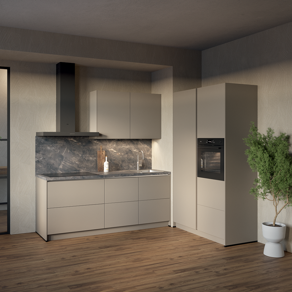 De Mira Bruin wordt geleverd met complete inbouwapparatuur die comfort en efficiëntie combineert. Afhankelijk van de gekozen uitvoering kan dit bestaan uit een inductiekookplaat, oven of combi-oven, geïntegreerde afzuiging, koelkast en vaatwasser. Hierdoor is de keuken direct klaar voor gebruik en biedt hij alle gemakken die je van een moderne keuken mag verwachten.
