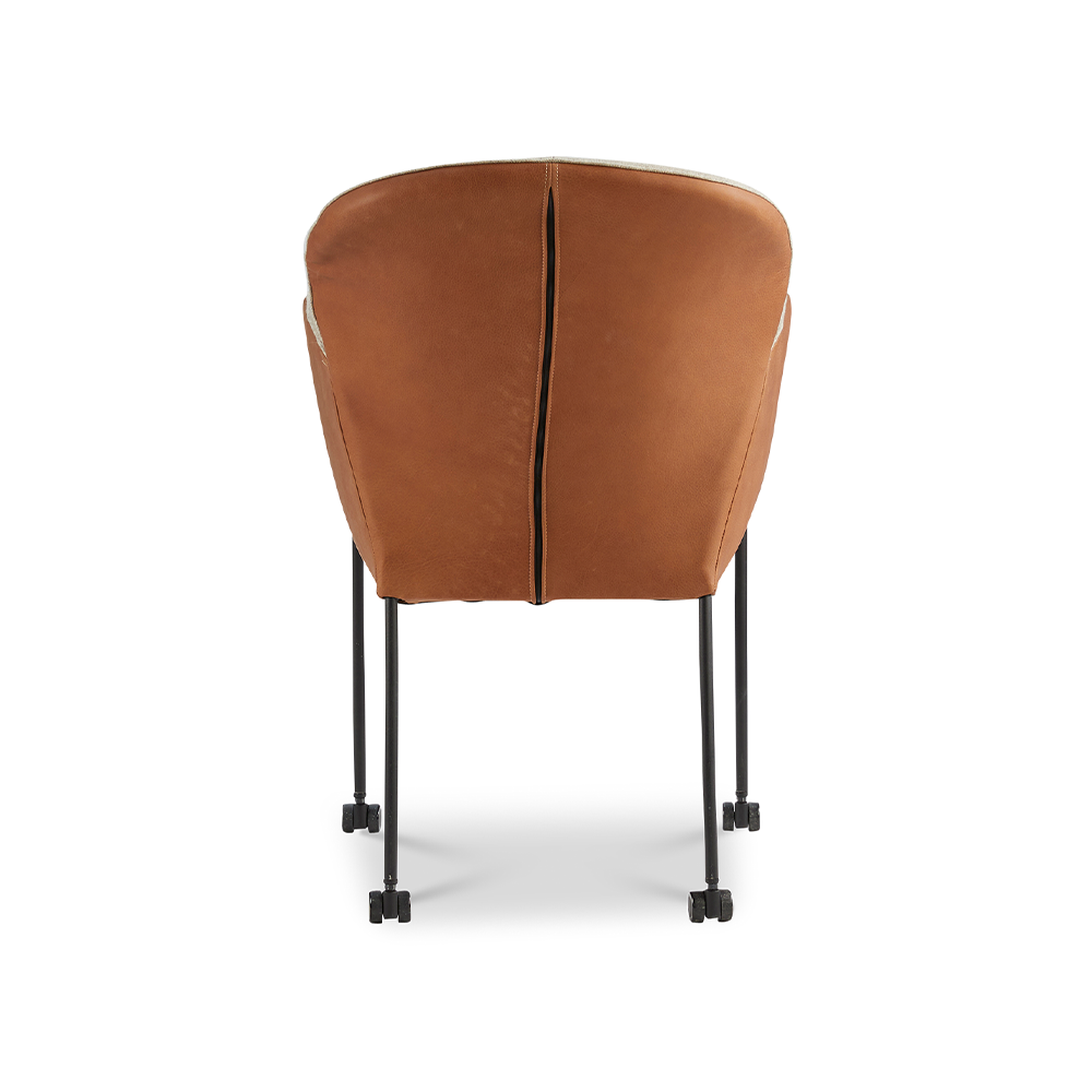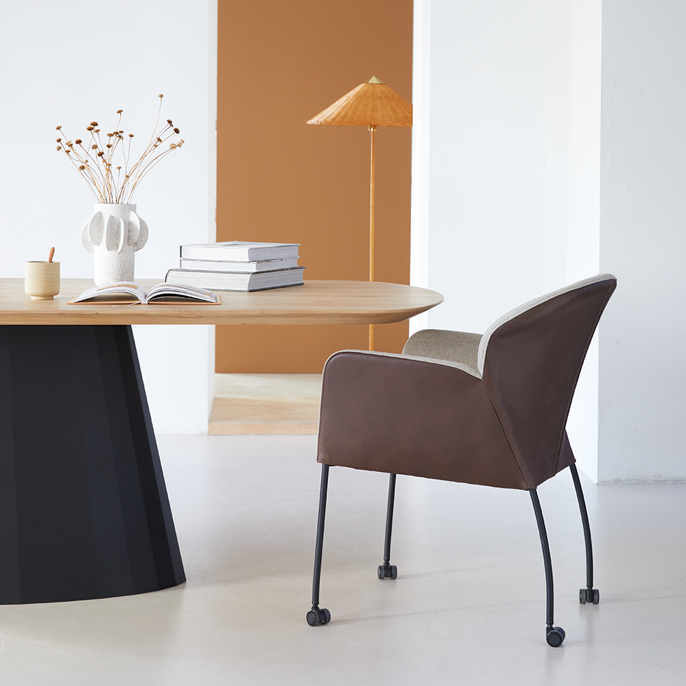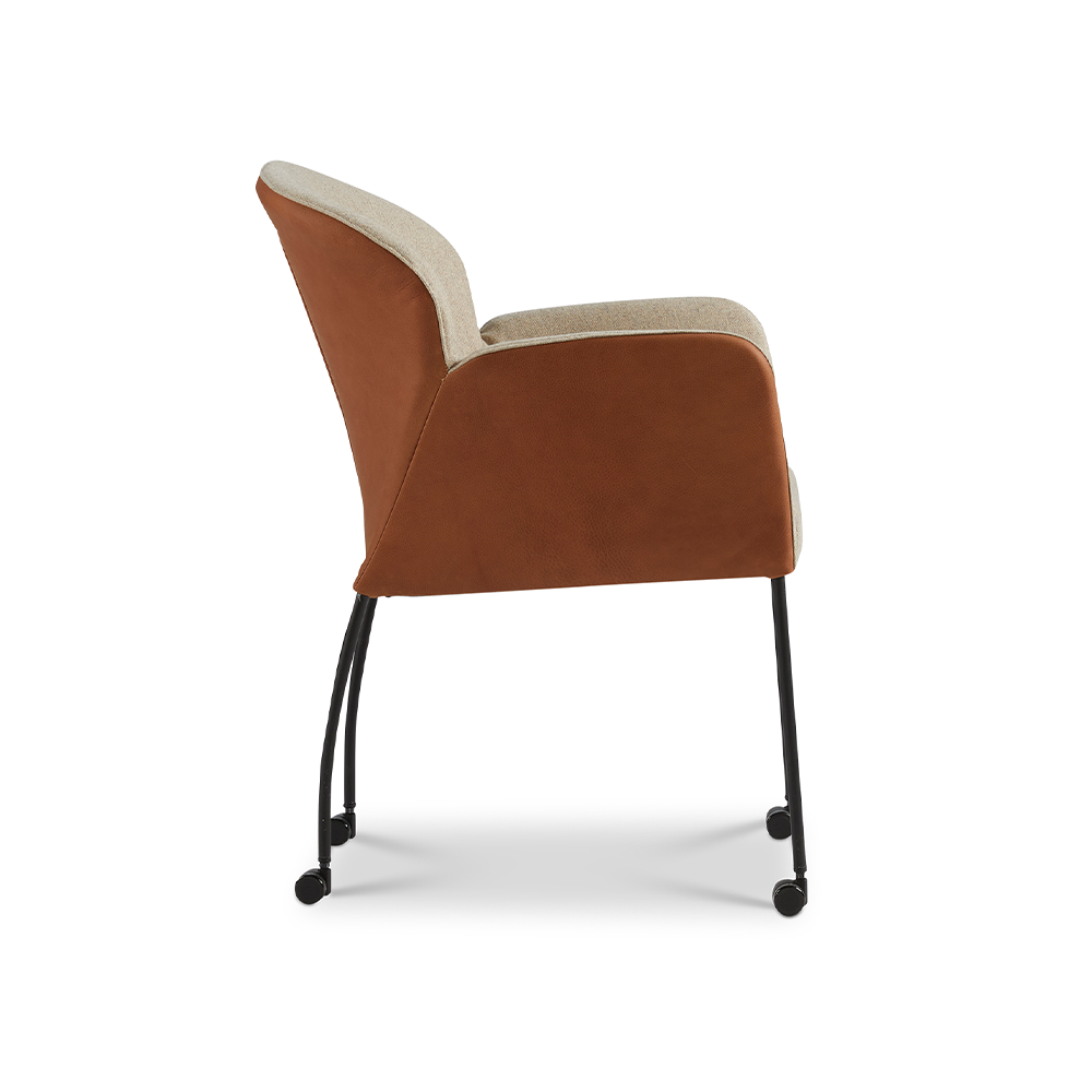 Armstoel Donna daar komen twee stijlen samen. Een armstoel met klasse, zeker in de stof/leer-uitvoering. Daarnaast is de ronde afwerking van de rug een fijn detail. De wieltjes geven de Donna een vrijelijk gevoel, je kan gaan waar je heen wilt. Het frame is in meerdere afwerkingen beschikbaar, elke kleur geeft zijn eigen uitstraling.