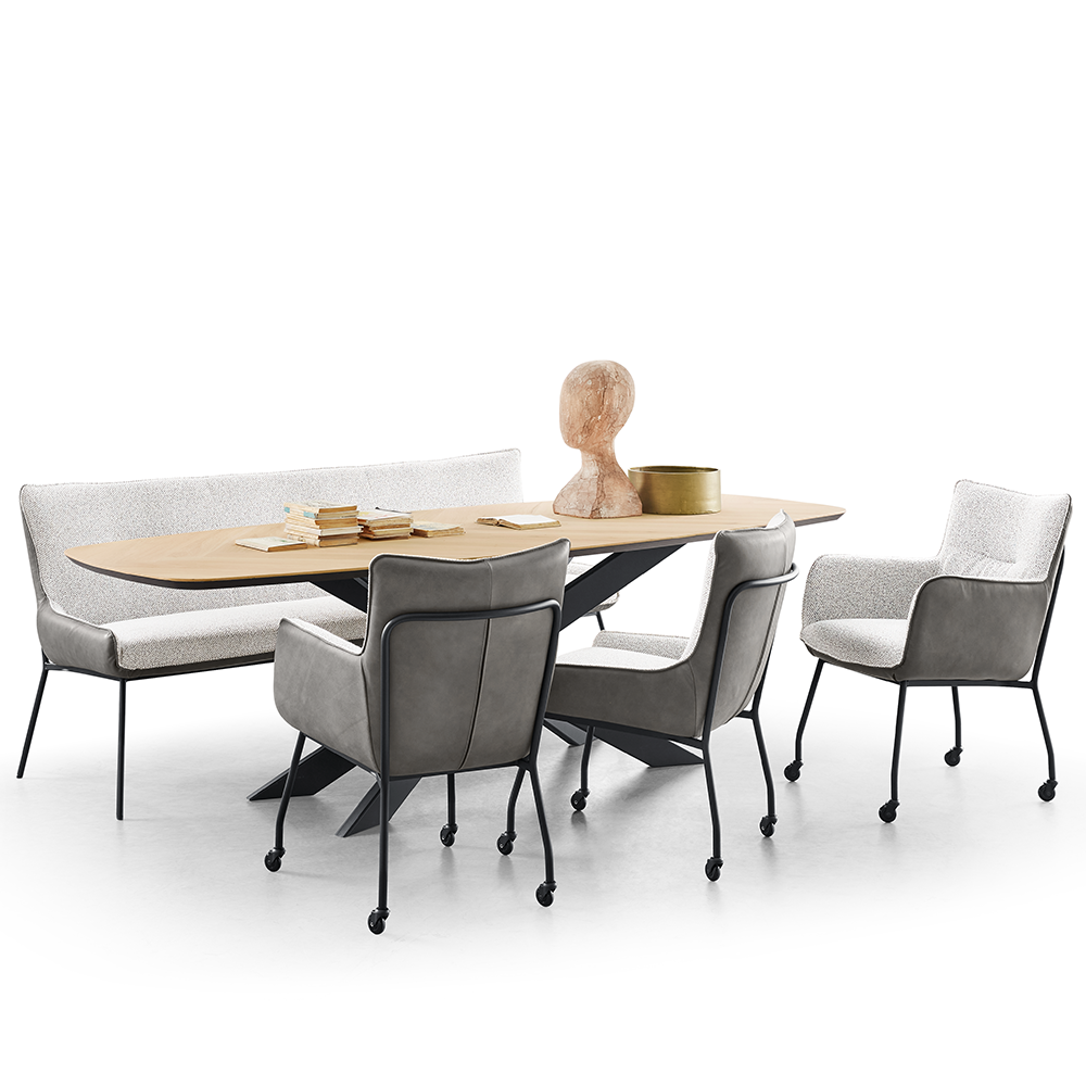 Daarnaast kan er een keuze gemaakt worden in een vaste poot of op skatewiel. Alsof er nog niet genoeg keuzes zijn, kun je bovendien ook nog eens een keuze maken uit de uitgebreide collectie stoffen en leersoorten. En wat dacht je van een combinatie van deze beide op één stoel? Ook dat kan met de armstoel Dutchz 1800. Of combineer de stoel met een House of Dutchz eetbank. Zo kun je jouw eigen eetmeubel samen stellen.