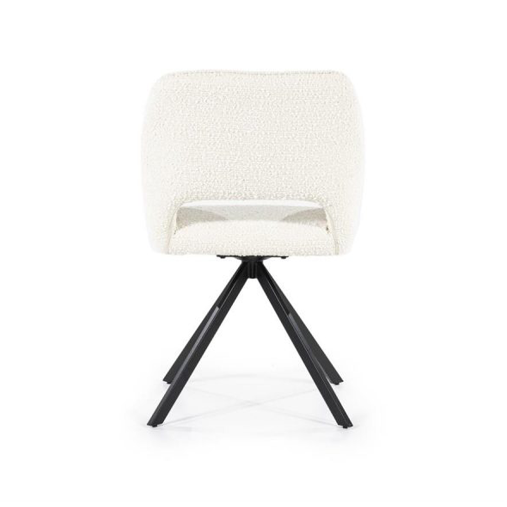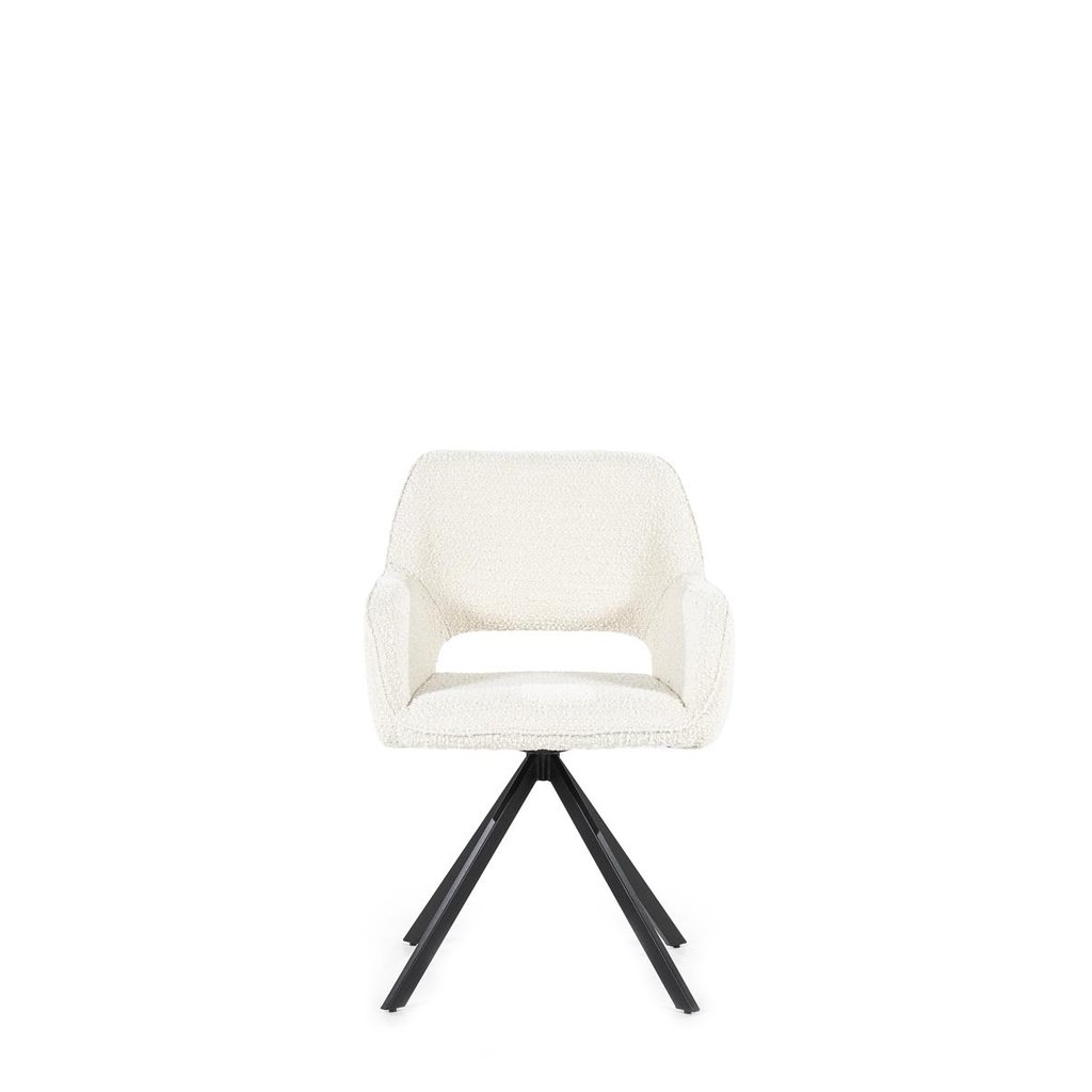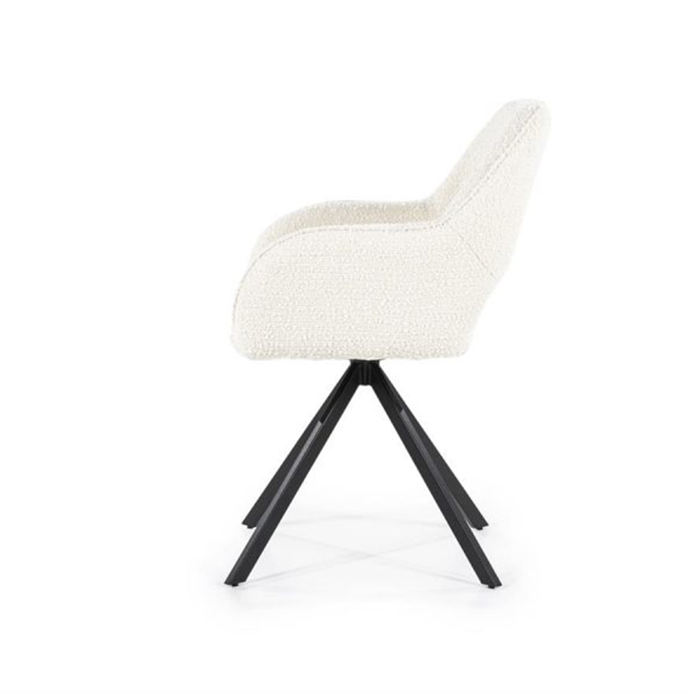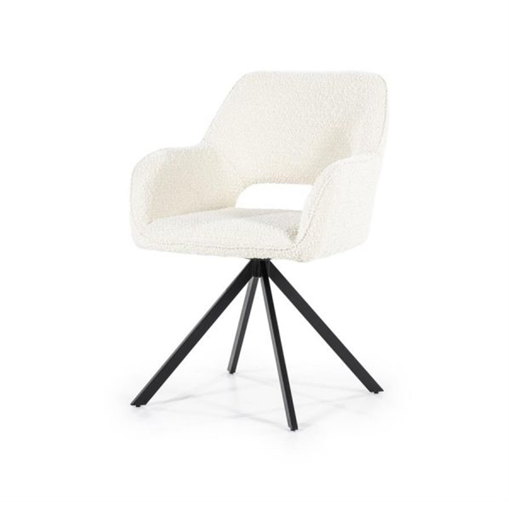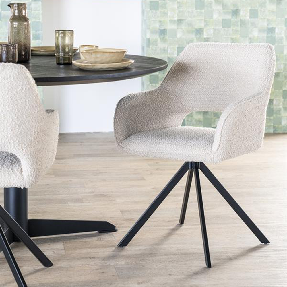 Armstoel Fabio beige is een moderne stoel met een heerlijke zachte stof. Je kunt met deze armstoel jouw eethoek laten stralen in drie verschillende kleuren, namelijk beige, zand en bruin. De stoel heeft een zwart metalen kruispoot die bovendien 360 graden draaibaar is. Verder loopt de rugleuning vloeiend over tot de armleuningen met onderin een opening. Met Fabio heb jij een mooie en zachte eyecatcher in het interieur.