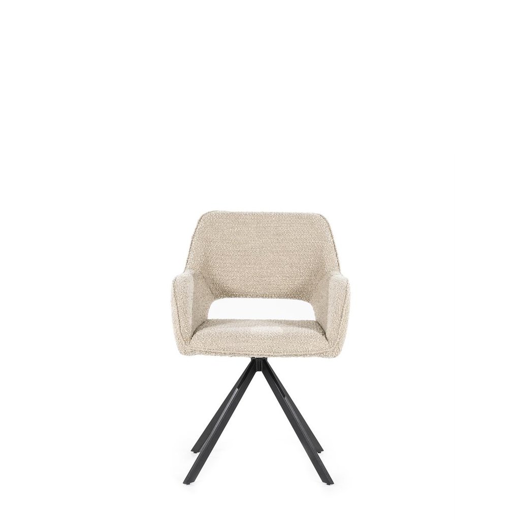 Armstoel Fabio zand is een moderne stoel met een heerlijke zachte stof. Je kunt met deze armstoel jouw eethoek laten stralen in drie verschillende kleuren, namelijk beige, zand en bruin. De stoel heeft een zwart metalen kruispoot die bovendien 360 graden draaibaar is. Verder loopt de rugleuning vloeiend over tot de armleuningen met onderin een opening. Met Fabio heb jij een mooie en zachte eyecatcher in het interieur.