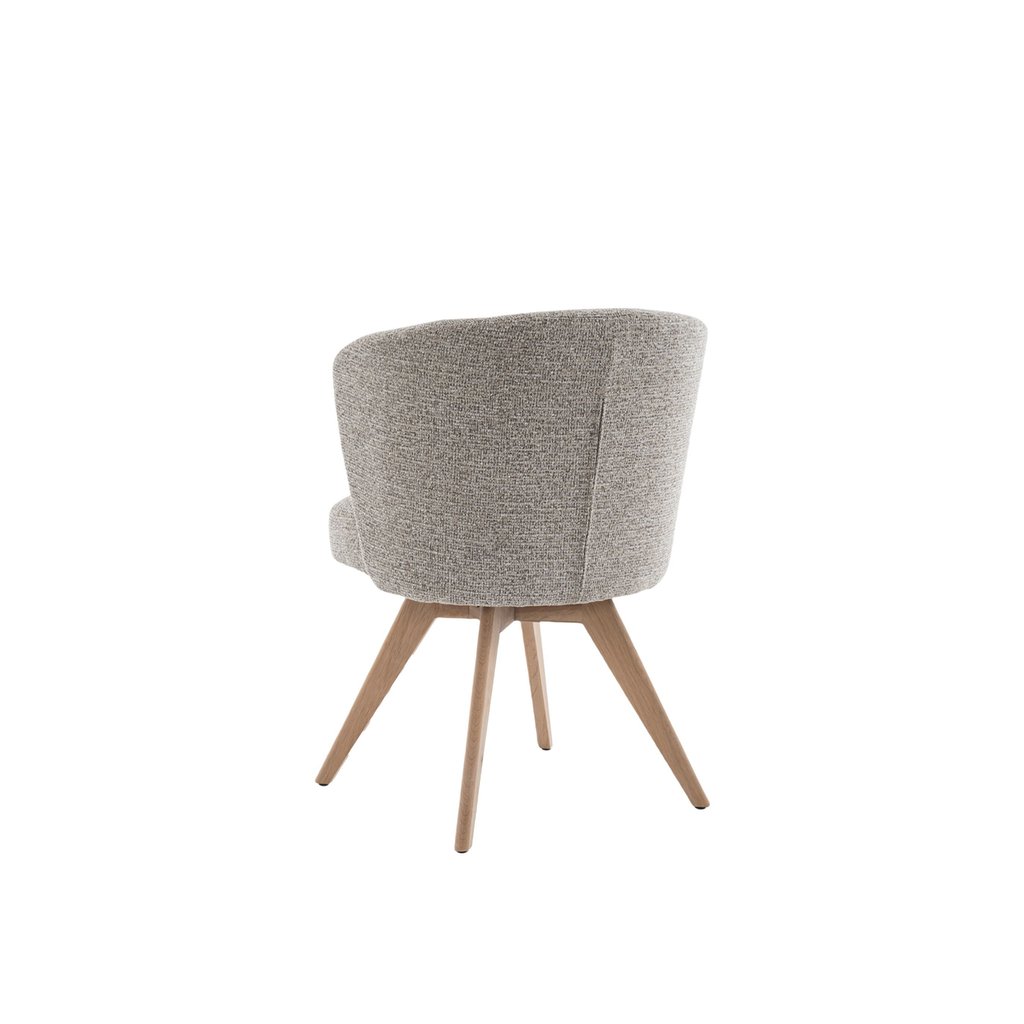 Deze uitvoering van de Mandolia armstoel is bekleed met een grof geweven stof in de kleur Present 172 Light Coffee. De lichtbruine tint zorgt voor een zachte, warme sfeer en combineert prachtig met het massief eiken onderstel. De natuurlijke uitstraling van het hout versterkt het uitnodigende karakter van de stoel en brengt balans in een strak of modern interieur.