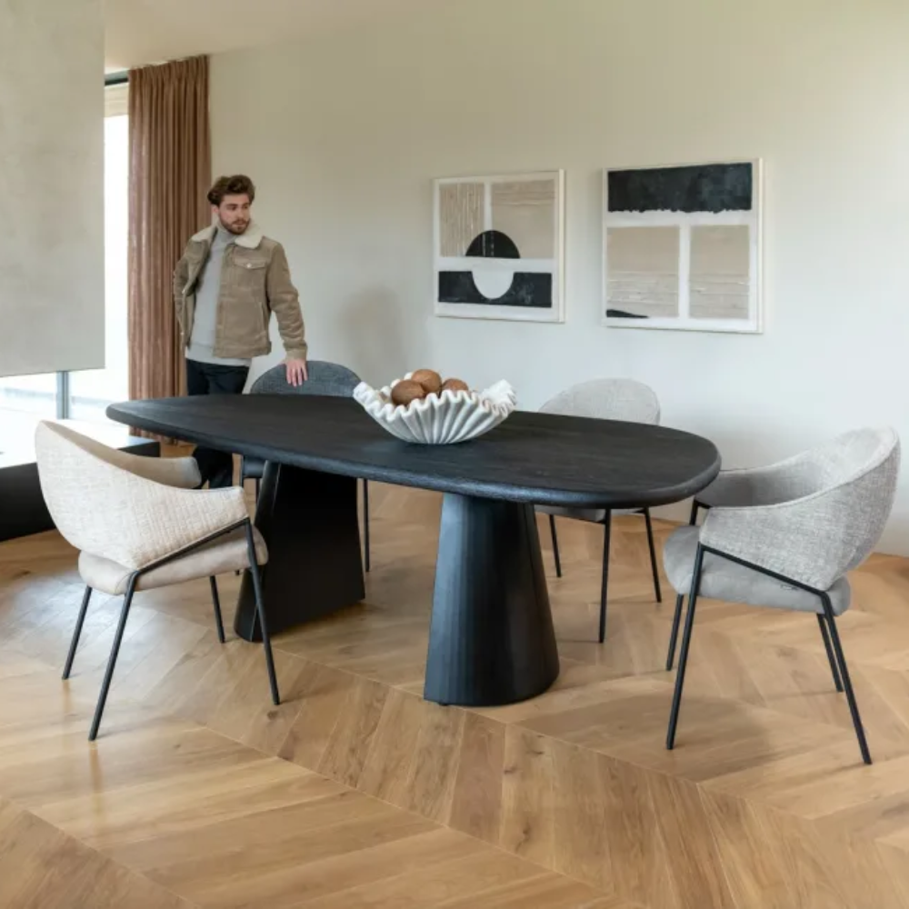De zitting en rug zijn ruim bemeten, zodat je comfortabel zit zonder dat de stoel log oogt. Met een breedte van ongeveer 56 centimeter en een diepte van 64 centimeter sluit Nolan perfect aan bij de meeste eetkamertafels. Het ranke, zwarte onderstel houdt de stoel luchtig en zorgt voor een stevige basis. Met een gewicht van circa 9,5 kilo voelt de armstoel solide en stabiel aan in het dagelijks gebruik.