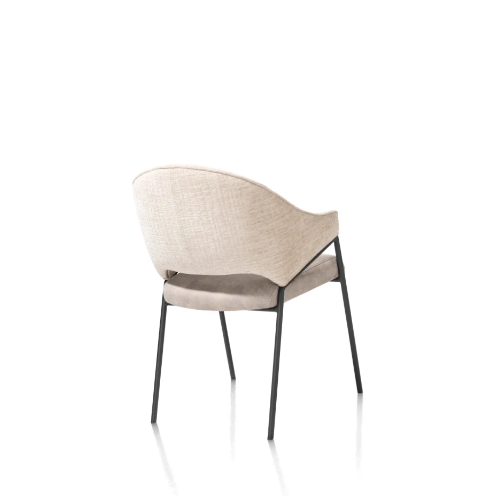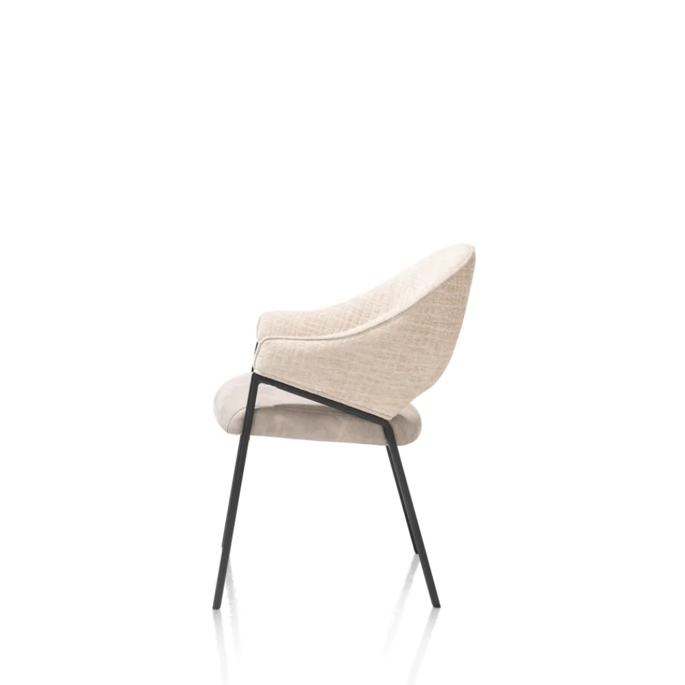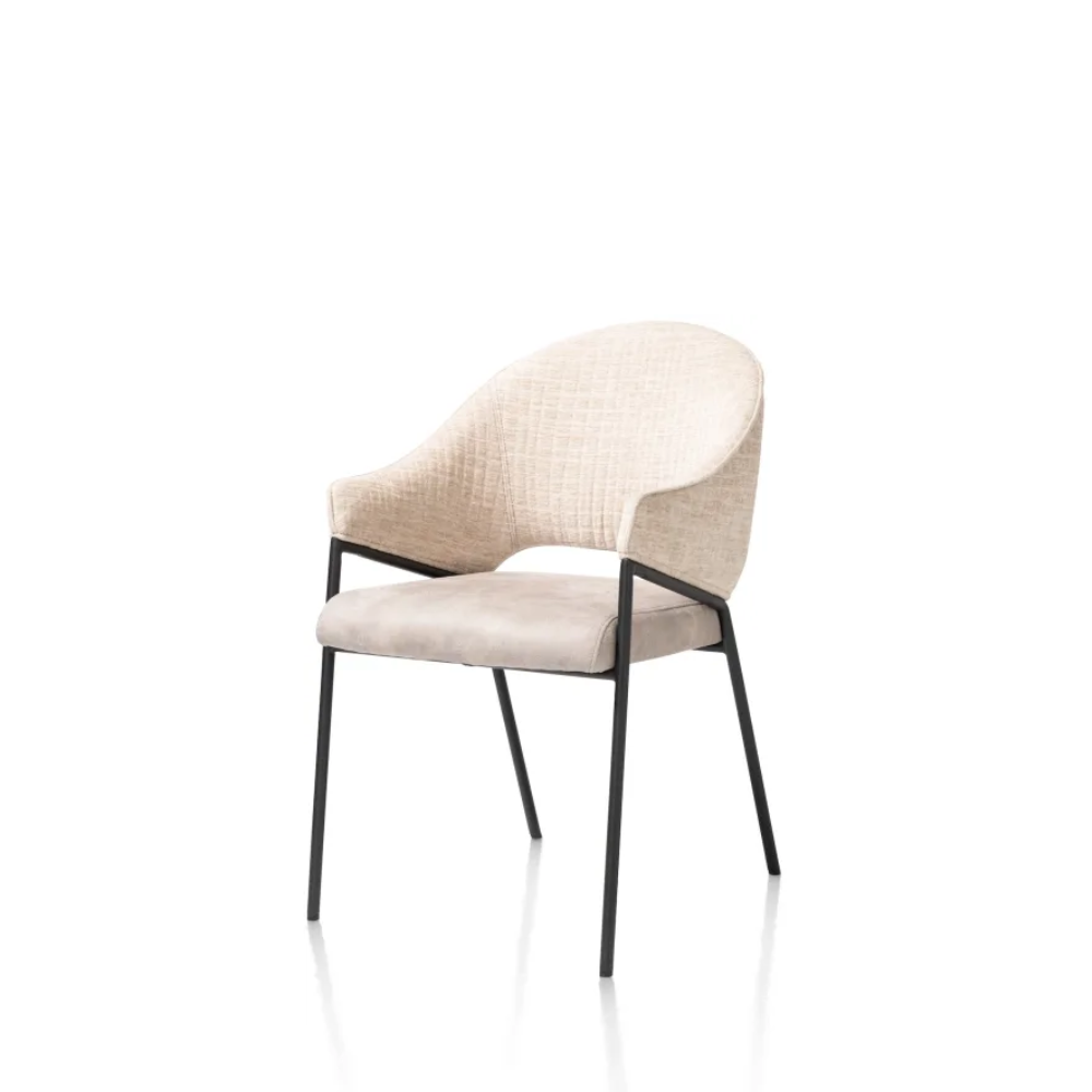 Armstoel Nolan Creme geeft je eethoek een lichte, elegante uitstraling. De combinatie van de luchtige crèmekleur met het zwarte metalen onderstel zorgt voor een modern contrast dat meteen opvalt, zonder druk te worden. De armleuningen nodigen uit om relaxed aan tafel te zitten, of je nu uitgebreid dineert, een kop koffie drinkt of aan de eettafel werkt. Dankzij de royale zitting en afgeronde vormen oogt Nolan vriendelijk en zacht, maar toch strak genoeg voor een eigentijds interieur.