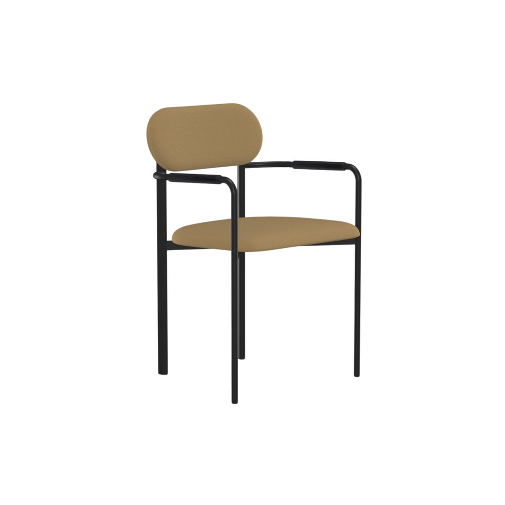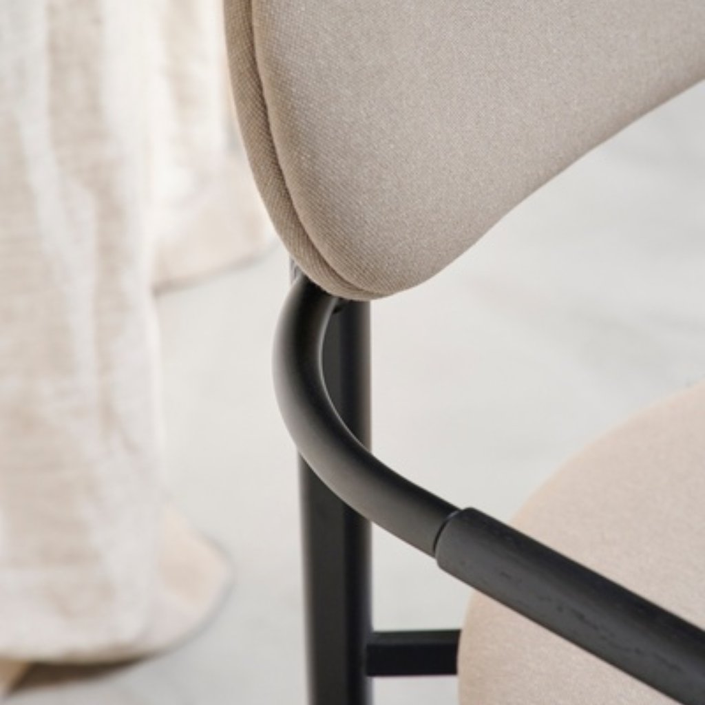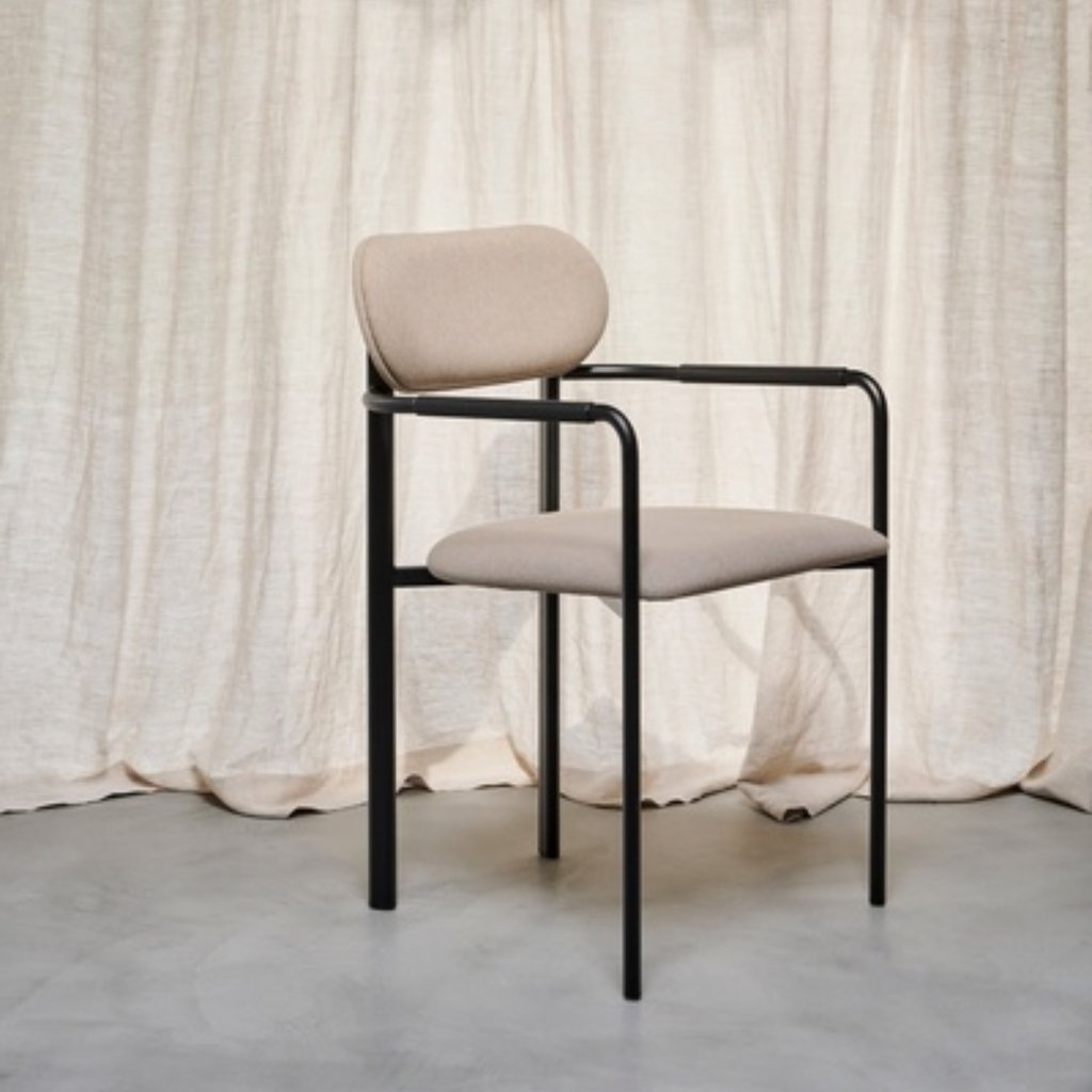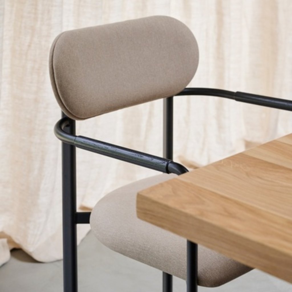 De kracht van armstoel Oblique zit in de stoffering. Kies uit fijne weefsels of rijkere texturen en stem de kleur af op vloer, tafelblad en verlichting. De gestoffeerde rug verbetert het zitcomfort en dempt geluiden licht, wat bijdraagt aan een rustige sfeer aan tafel. De ergonomische kuip volgt de rug en verdeelt de druk prettig. De armen zijn slank vormgegeven zodat de stoel onder de meeste tafelbladen past. Dat maakt aanschuiven eenvoudig en houdt het geheel luchtig. Oblique sluit naadloos aan bij Scandinavische en Japandi interieurs, maar voelt zich ook thuis in moderne of licht industriële settings. Ton sur ton oogt kalm en ruimtelijk. Contrast met een iets donkerdere zitting geeft diepte en karakter. Plaats viltglijders onder de poten bij harde vloeren en behoud de soepele, stille beweging rondom de tafel.