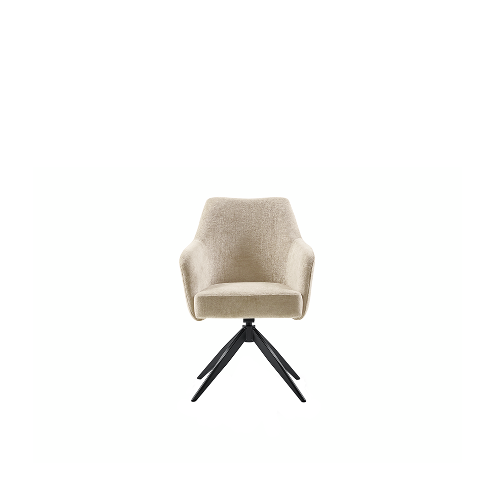 De geselecteerde stoffen bieden een prettige touch en tonen hun kleur rijk en vol. De open arm geeft extra lucht rondom de tafel en een speels silhouet. Met de dichte arm benadruk je juist comfort en een omhullend gevoel. Het zwart metalen onderstel geeft stabiliteit zonder zwaar te ogen en maakt combineren met hout, keramiek of natuursteen eenvoudig. De geïntegreerde terugdraaifunctie verhoogt het gebruiksgemak in dagelijks ritme. Mix meerdere stoelen in één kleur voor rust of combineer open en dichte armen aan dezelfde tafel voor een subtiel dynamisch beeld dat altijd in balans blijft.