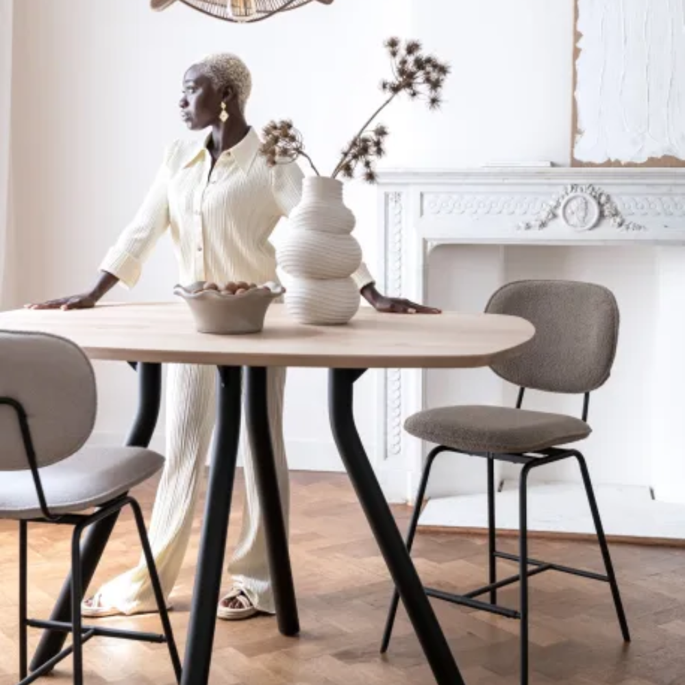 Lexi is 180 graden draaibaar en heeft een handige terugdraaifunctie. Zodra je opstaat, draait de zitting automatisch terug naar de oorspronkelijke positie. Dat oogt netjes en rustig rond het eiland. De geïntegreerde handgreep in de rug maakt het verschuiven van de stoel extra makkelijk. Het onderstel in zwart metaal zorgt voor stabiliteit en een moderne look, terwijl de zachte bouclé zitting voor een comfortabel zitgevoel zorgt. Met een passende textile care set houd je de stof eenvoudig mooi en fris.