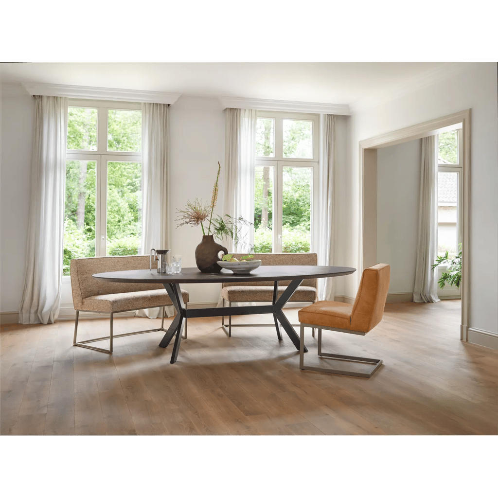 Eetbank Rona ovaal een industriële en stoere eetkamerbank. De bank is leverbaar in geschuurd leder en heeft een metalen onderstel, maar je kan ook kiezen voor een stoffen bekleding. Bovendien is Rona een comfortabele bank die ideaal is voor eindeloos tafelen met vrienden en familie. De bank heeft namelijk een hoge rug en diepe zitting, waardoor hij ontzettend lekker zit. Bij de Rona eetkamerbank kan je ook kiezen voor de Rona eet- of armstoel. Deze twee zijn leuk om te combineren, bijvoorbeeld rondom een van onze industriële eettafels.