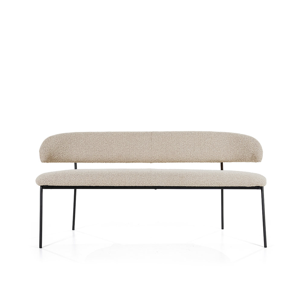 Het metalen onderstel in zwart gecoat staal geeft eetbank Luka een robuuste basis die prachtig contrasteert met de aaibare stof. De slanke poten en het luchtige design zorgen ervoor dat de bank niet zwaar oogt in je interieur, terwijl hij toch voldoende stevigheid en zitcomfort biedt. De neutrale kleurkeuze – beige of taupe – maakt Luka eenvoudig te combineren met verschillende tafels, stoelen en woonstijlen. Van Scandinavisch licht tot industrieel donker, Luka voelt zich overal thuis.